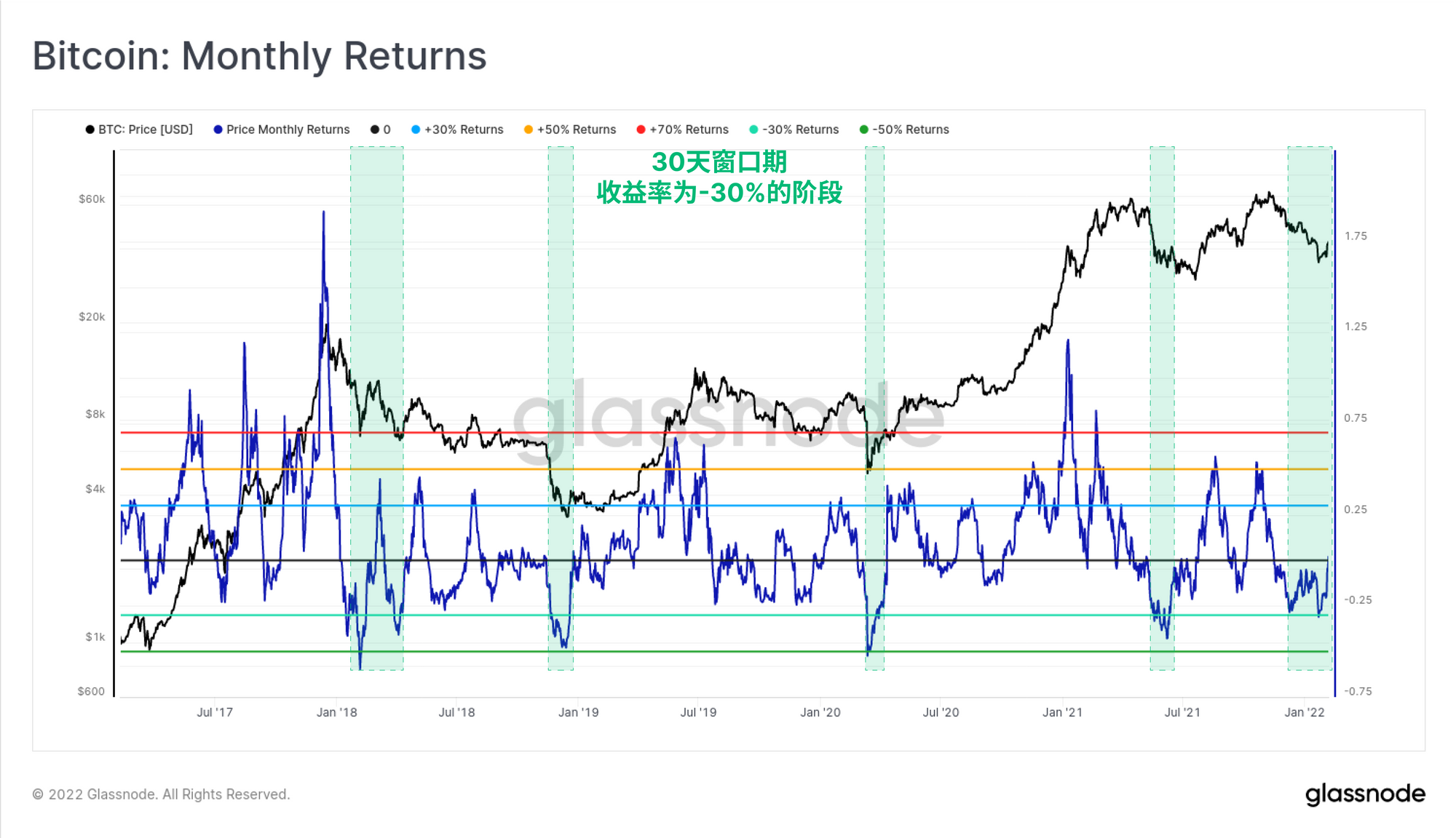 这一上升趋势是在相当持续的三个月的下降趋势之后发生的,这将比特币的月度回报率曲线推到了负值区域。下图显示了30天内的比特币回报率(%),历史上-30%的负回报率是超卖条件的标志。在过去5年中,月度回报率如此惨淡只出现过5次。