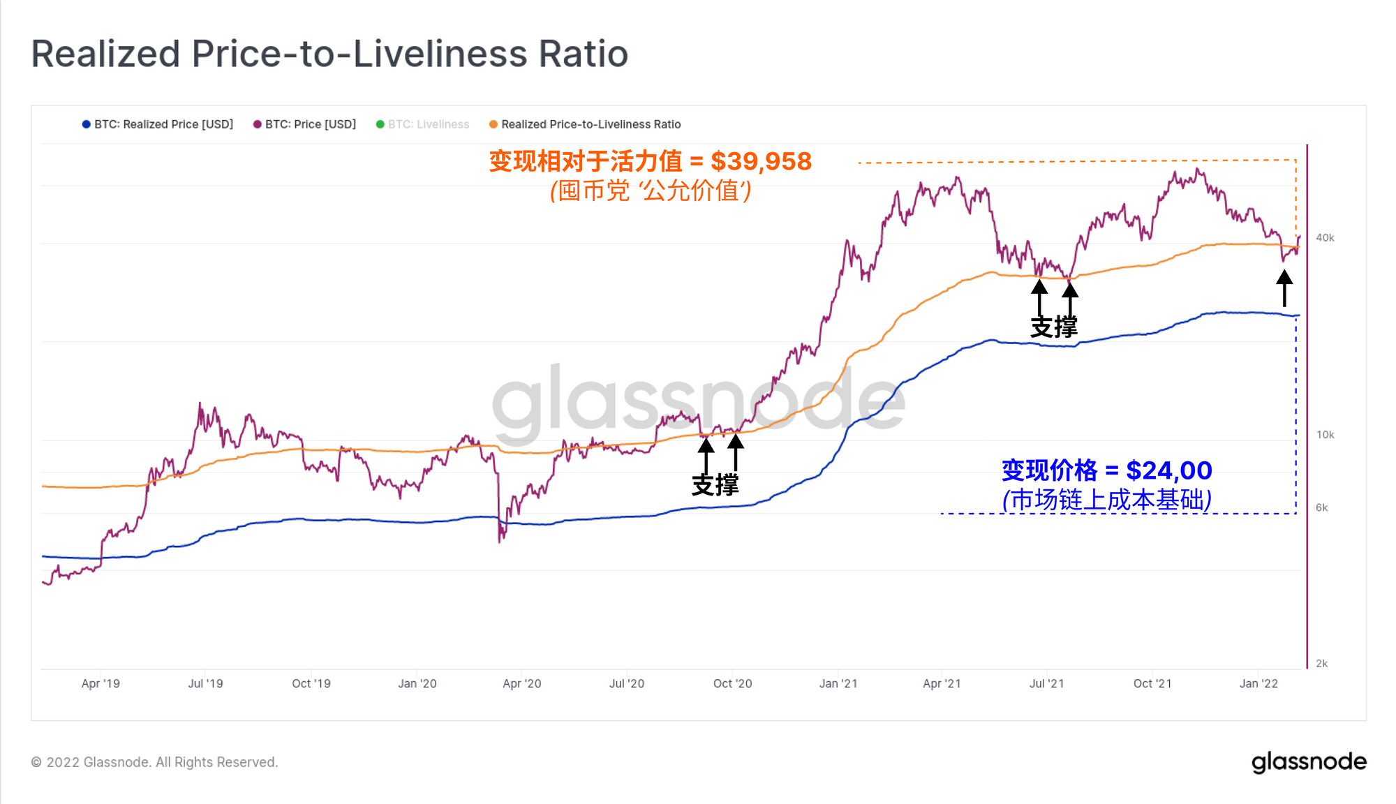另一个反映 "公允价值 "的指标是 "实现与活力比率"(RTLR),有人提议利用此指标来估计由囤币党群体定价的比特币的 "公允价值"。在比特币严重休眠期间,活力下降,因此,当活力被置于分母中时,变现价格被放大(反之亦然)。