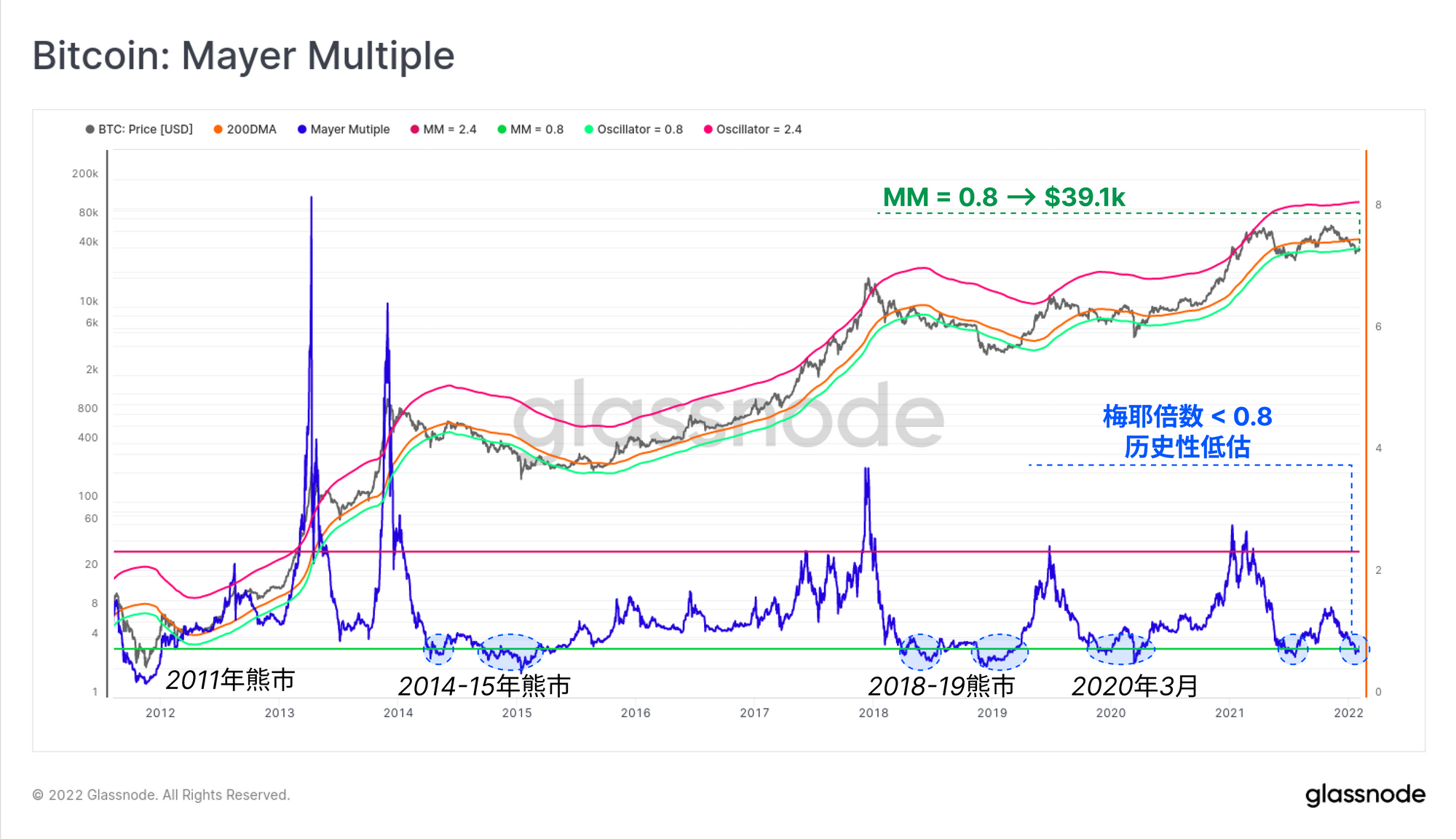 其中一个最简单,但仍然非常强大的工具是梅耶倍数,为价格和200天移动平均线之间的比率。在技术分析中,交易员普遍采用200天移动平均作为长期的牛/熊指标,因此,低于此指标的陡峭偏差可以表明相对于长期平均值的低估程度。本周梅耶倍数低于0.8,代表相对于200天移动平均的20%以上的折扣。梅耶倍数为0.8时所对应的价格是3.91万美元,现在市场已经恢复(计算为0.8 x 200天移动平均)。