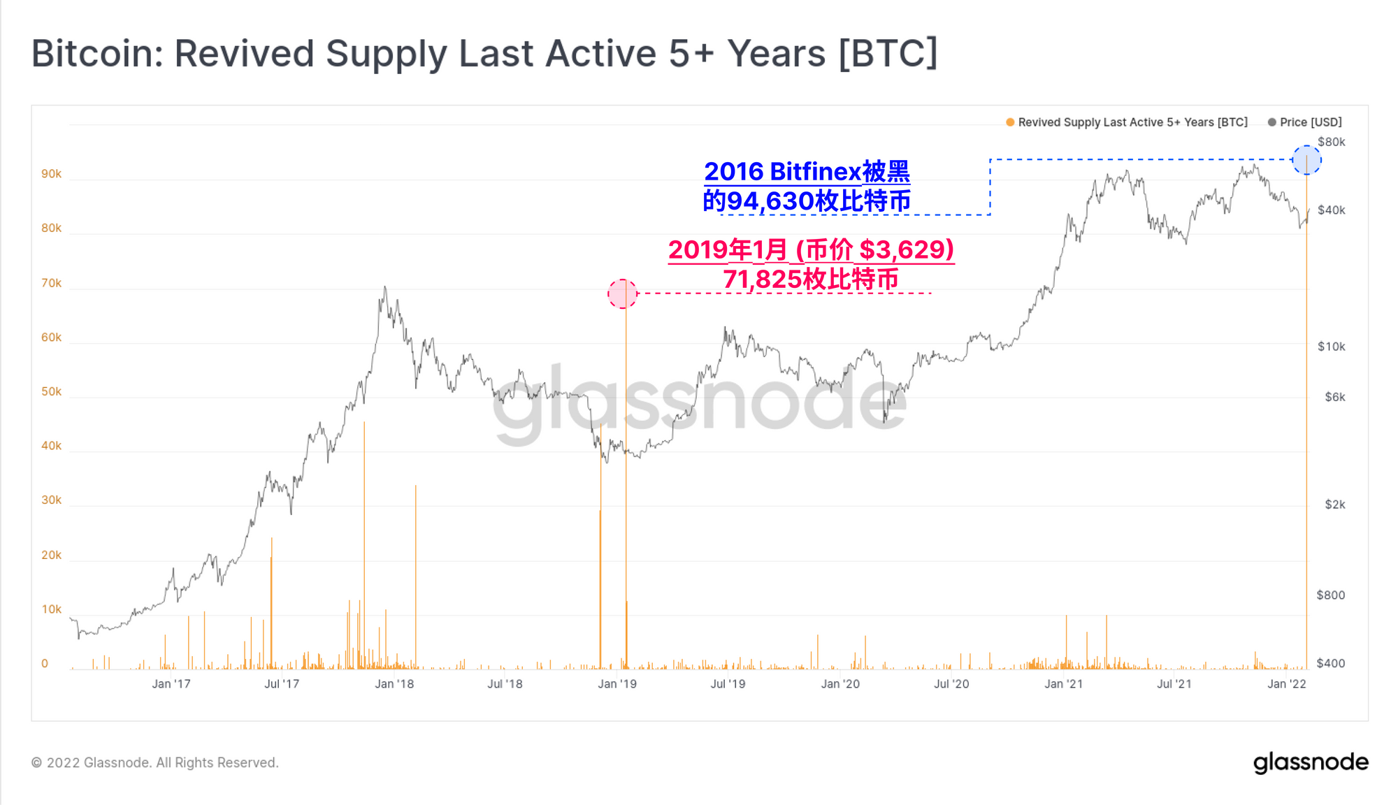 我们可以看到,在币龄大于5年的复苏供应中,此次卖出是历史上币龄在5年以上的最大一笔卖出,超越了2019年1月的71825枚,彼时的价格是3629美元。