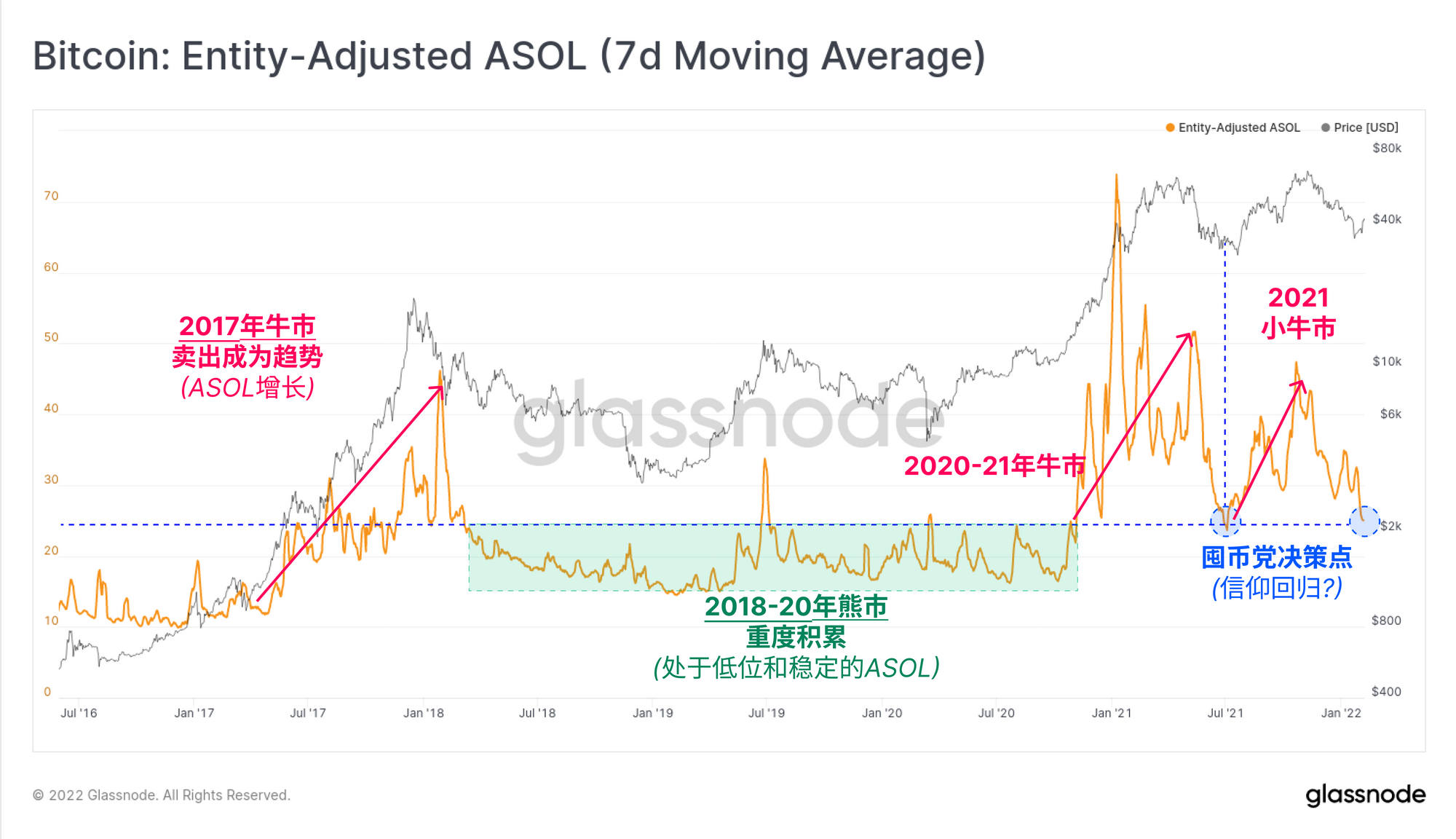 ASOL没有对Bitfinex钱包做出有意义的反应,实际上,该值已经跌落到2021年6月最后一次访问的低点。ASOL的上升趋势是典型的,旧币的广泛卖出通常发生在牛市。相比之下,像现在这样的下降趋势表明囤币是首选行为,这与活跃度的宏观规模下降趋势一致。