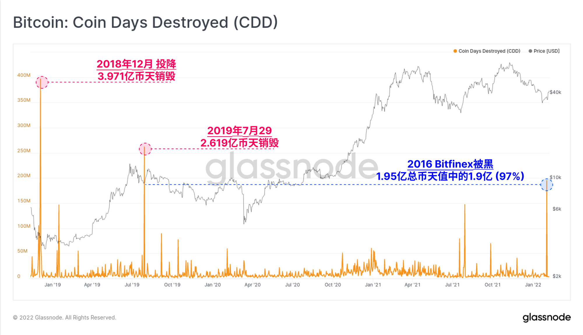 销毁的比特币日也飙升至多年来的高点,总共销毁了1.95亿个币天,其中1.9亿个(97%)与Bitfinex钱包有关。