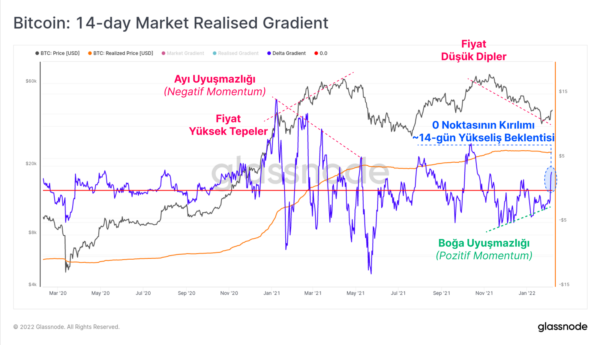 Ayrıca 14 günlük Piyasa Gerçekleşen Gradyan (MRG) osilatöründe oldukça büyük bir yükseliş ayrışması görebiliriz. Bu metrik, Gerçekleşen üst sınırda yakalanan doğal sermaye girişlerine göre piyasa fiyatlandırmasındaki momentum derecesini modeller. Genel yorum şu şekildedir: