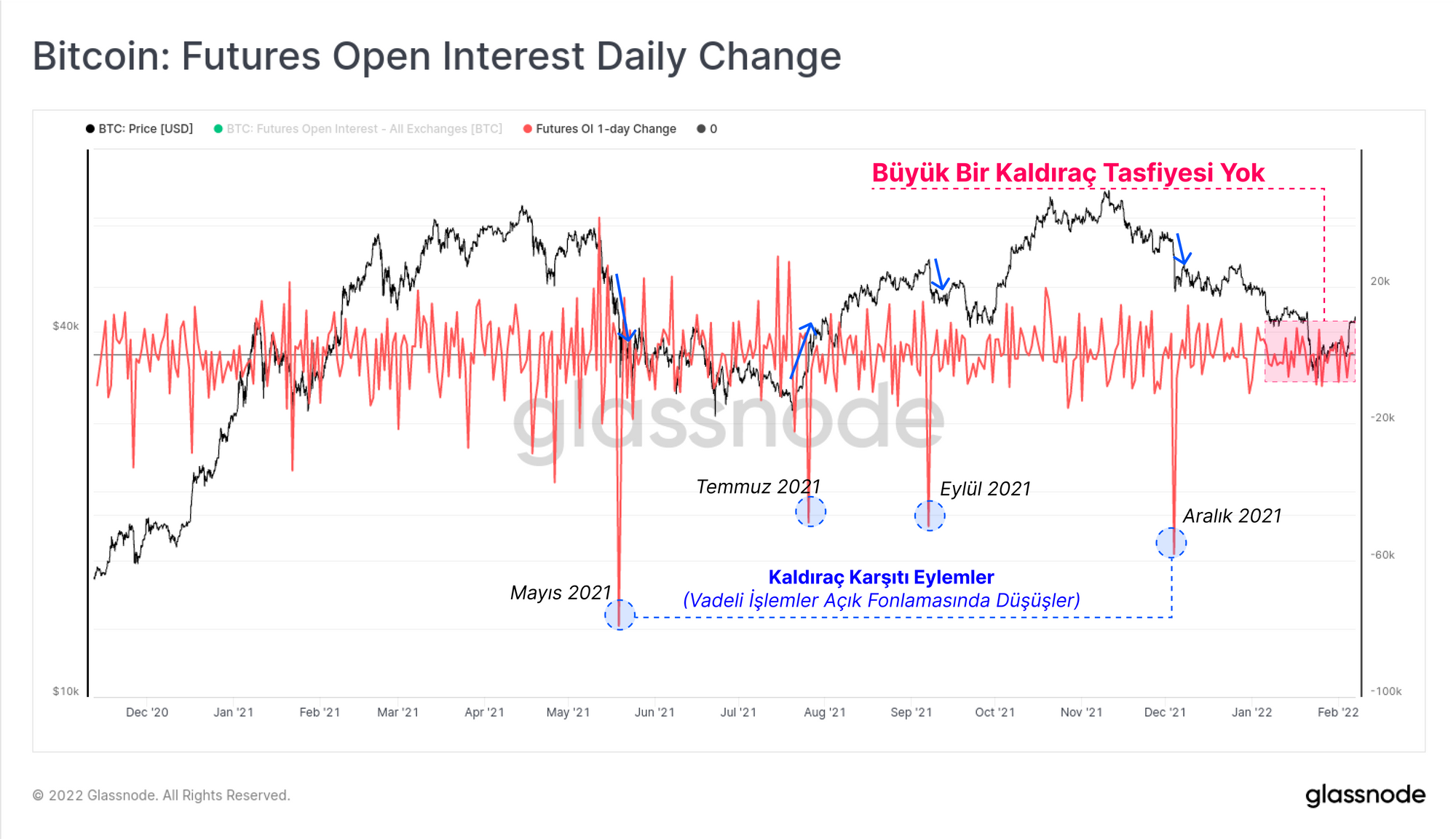 Bu grafikte, büyük miktarda açık sözleşmenin zorla kapatıldığı klasik kaldıraç azaltma olayını henüz görmediğimiz Vadeli İşlemler Açık Pozisyonundaki 1 günlük değişiklikle büyük ölçüde doğrulandı. Bununla birlikte, Vadeli İşlem Açık Faizi, Bitcoin Piyasa değerinin yaklaşık %1,91'inden (~15 Milyar$) yüksek kalmaya devam ediyor.