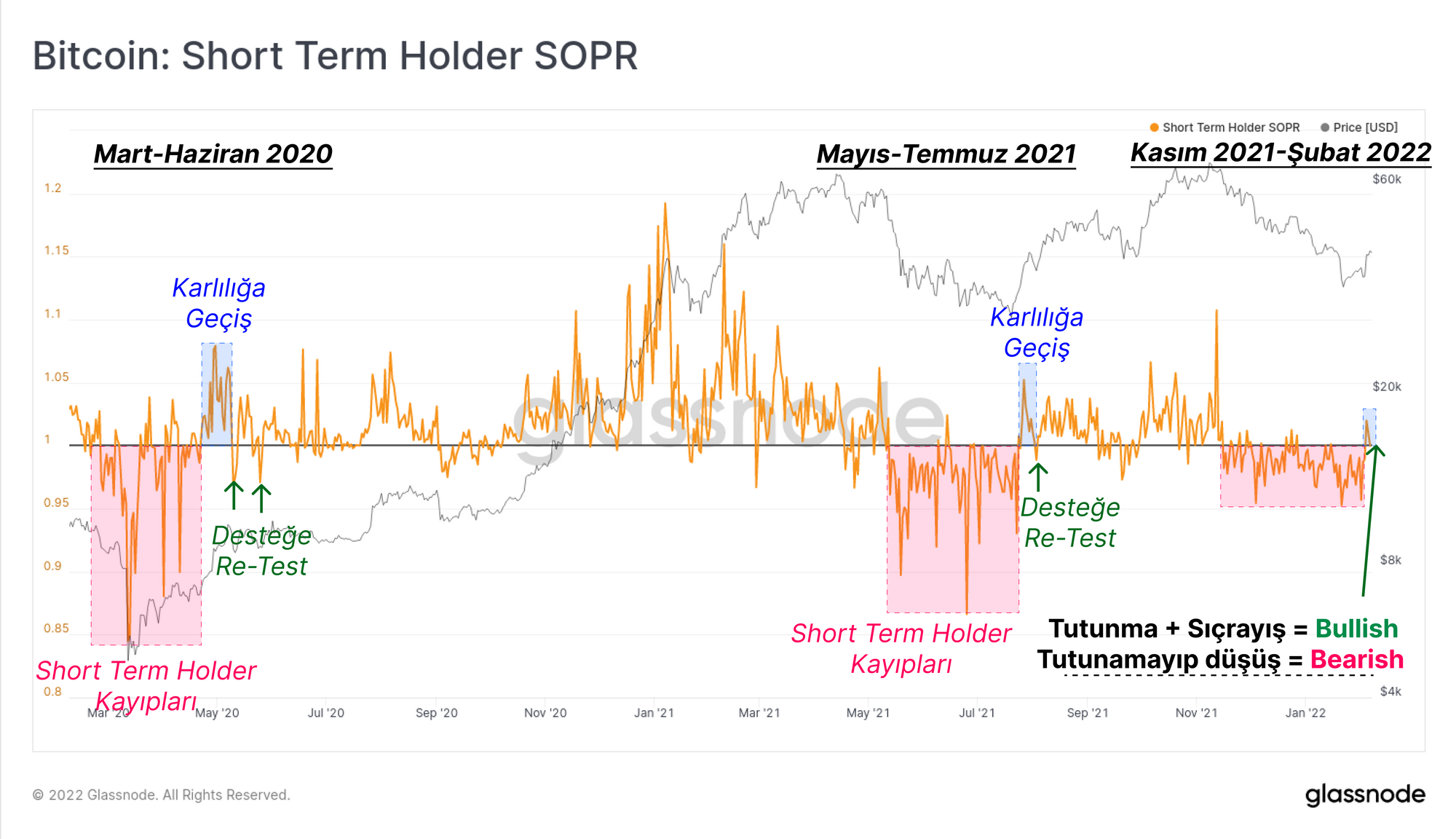 Benzer bir STH-SOPR hareketi, Mart 2020'den bu yana iki durumda görülmekte. Uzun bir kayıp döneminden sonra, piyasa, STH-SOPR'nin 1,0'lık re-testinin doğrulanmasıyla yükseliş eğilimine girmeyi başardı. STH-SOPR'nin tekrar yükselişe geçtiğini görürsek, bu yenilenen karlılığı ve talep akışlarının coinleri absorbe ettiğini gösterir. Tersine, 1.0'ın altına bir geri dönüş, düşüş göstergesi olabilir ve STH'lerden gelen satış baskısını desteklemek için yetersiz talep olduğunu gösterir.