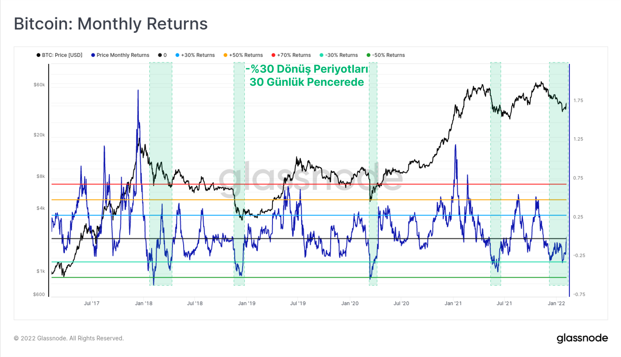 Bu yükseliş, Bitcoin için aylık getiri profilini olumsuz bölgeye iten oldukça kalıcı üç aylık bir düşüş trendini takip ediyor. Aşağıdaki grafik, tarihsel olarak aşırı satım durumunu işaret eden -%30'luk negatif getirilerle, 30 günlük bir dönem boyunca Bitcoin getirilerini (% olarak) göstermektedir. Aylık getiriler, son 5 yılda sadece beş dönemde bu kadar zayıf oldu: