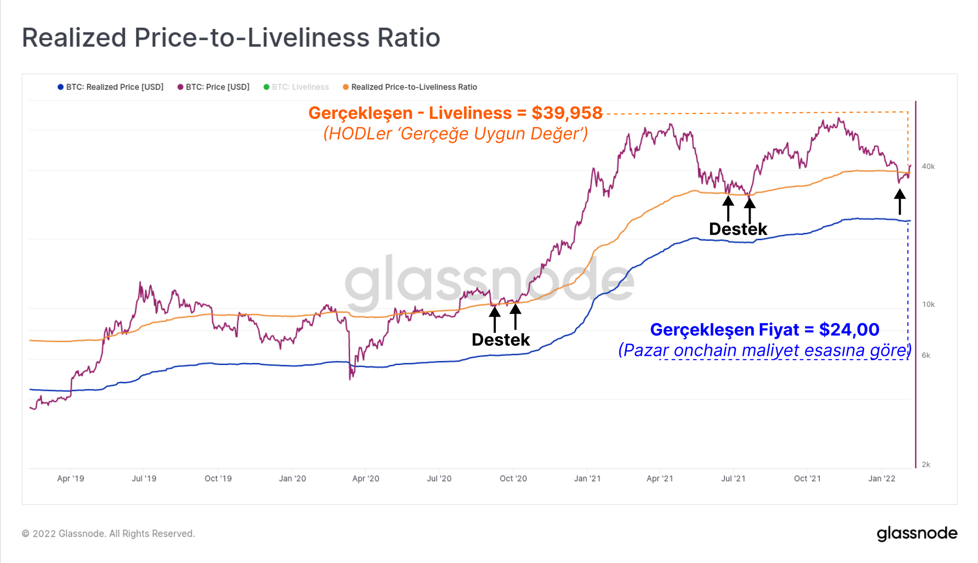 'Gerçeğe uygun değeri' yansıtan başka bir metrik, HODLer topluluğu tarafından fiyatlandırılan Bitcoin'in 'gerçeğe uygun değerini' tahmin etmek için önerilen Gerçekleşen Canlılık Oranıdır (RTLR). Coinlerin yoğun olduğu dönemlerde, Canlılık azalır ve Canlılık paydaya yerleştirildiğinde gerçekleşen fiyat artar (ve tersi).