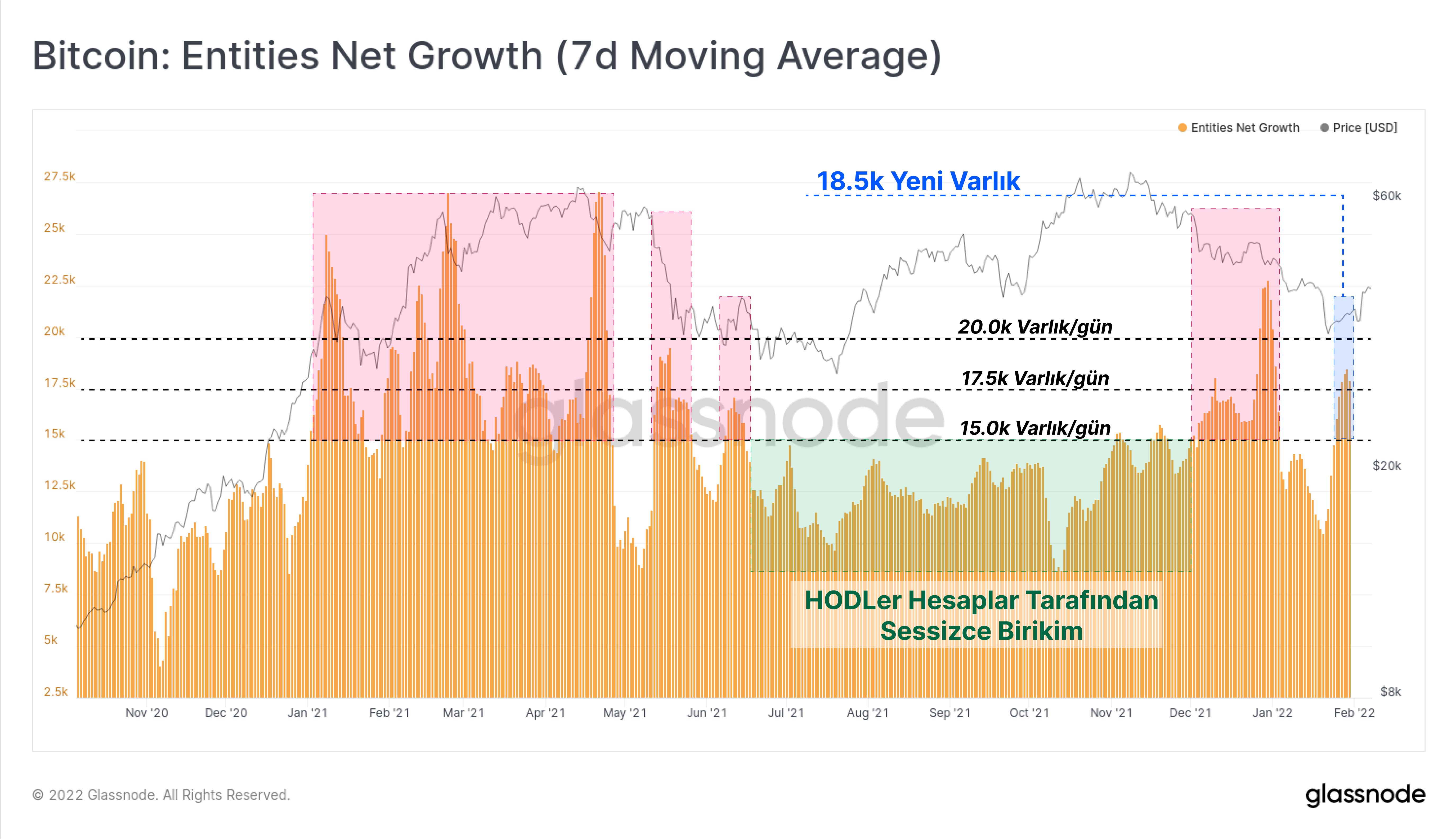Haziran-Aralık 2021, ağa her gün giren 12,5 bin net varlığın sabit bir taban çizgisi ile sessiz bir birikim dönemiydi. Bu nedenle, Ocak ve Şubat aylarındaki son ani artışlar, HODLer mantığının egemenliğinin kısa süreli kaybından sonra yeniden kazanılması veya en azından daha cazip giriş fiyatlarına kadar işlem yaptıktan sonra Bitcoin'e olan ilginin yenilendiğini gösterebilir.