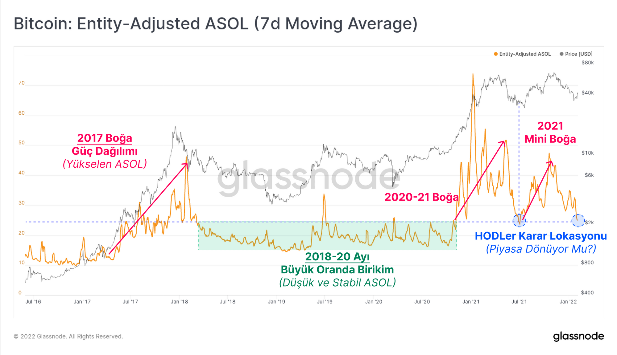 ASOL, Bitfinex cüzdanına anlamlı bir yanıt vermedi ve aslında en son Haziran 2021'de ziyaret edilen en düşük seviyeleri ziyaret etti. ASOL'daki yükseliş trendleri, genellikle boğa piyasalarında, daha eski coinler tarafından yaygın bir dağılım olduğunda birbirine benzerdir. Buna karşılık, masadaki gibi düşüş trendleri, Liveliness'teki makro ölçekli düşüş trendi ile tutarlı olan HODLing'in tercih edilen davranış olduğunu öne sürüyor.