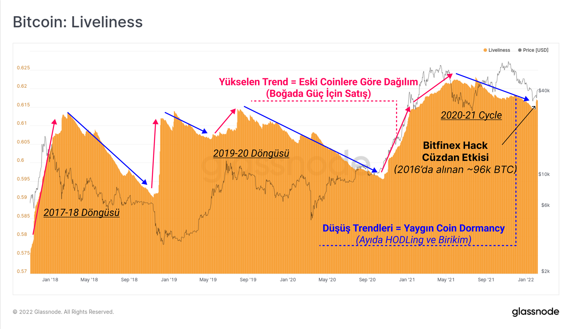 Yukarıda belirtildiği gibi, azalan bir Liveliness metriği, tüm coin arzı boyunca harcananlara kıyasla, daha büyük miktarda coinin hareketsiz olduğunu ve birikerek ömrünün (coin günleri) arttığını ve coin günlerini yok ettiğini gösterir. Bu, HODLer birikimi dönemlerinin tipik bir örneğidir ve genellikle ayı piyasalarıyla aynı anlama gelir.
