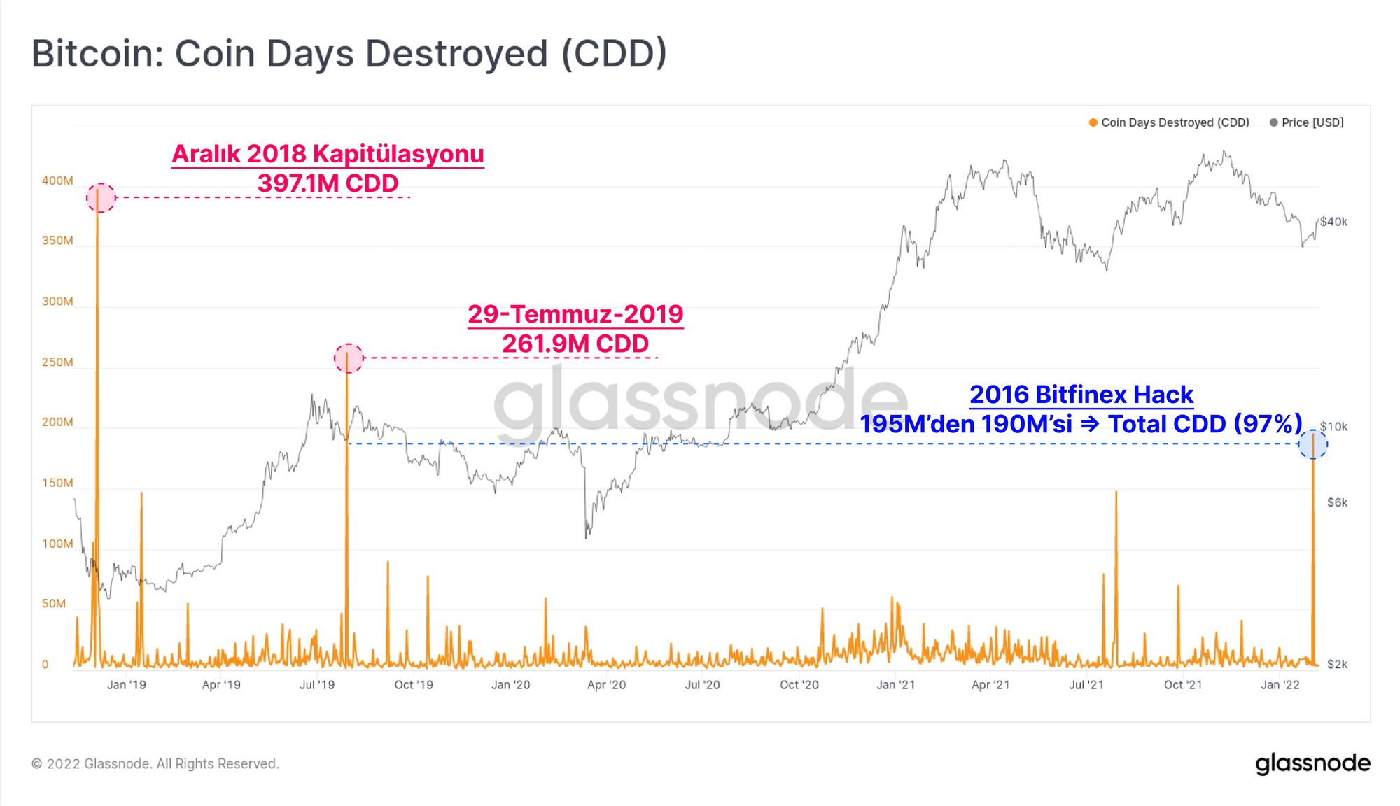 Bu hafta bir dizi onchain ölçümü, 2016 Bitfinex hackinden elde edilen BTC cüzdanlarıyla ilişkili çok büyük bir 94.643 BTC'lik satış tespit etti ve bunun piyasa değeri 3.67 Milyar Dolar. Hem coin hacmi hem de USD değeri, elde edilen kâr ve yok edilen kullanım ömrü olarak dikkate alındığında, bu, zincirdeki anormal olayların metrik yorumlamayı nasıl etkilediğini değerlendirmede ilginç bir olay olarak ortaya çıkmakta.