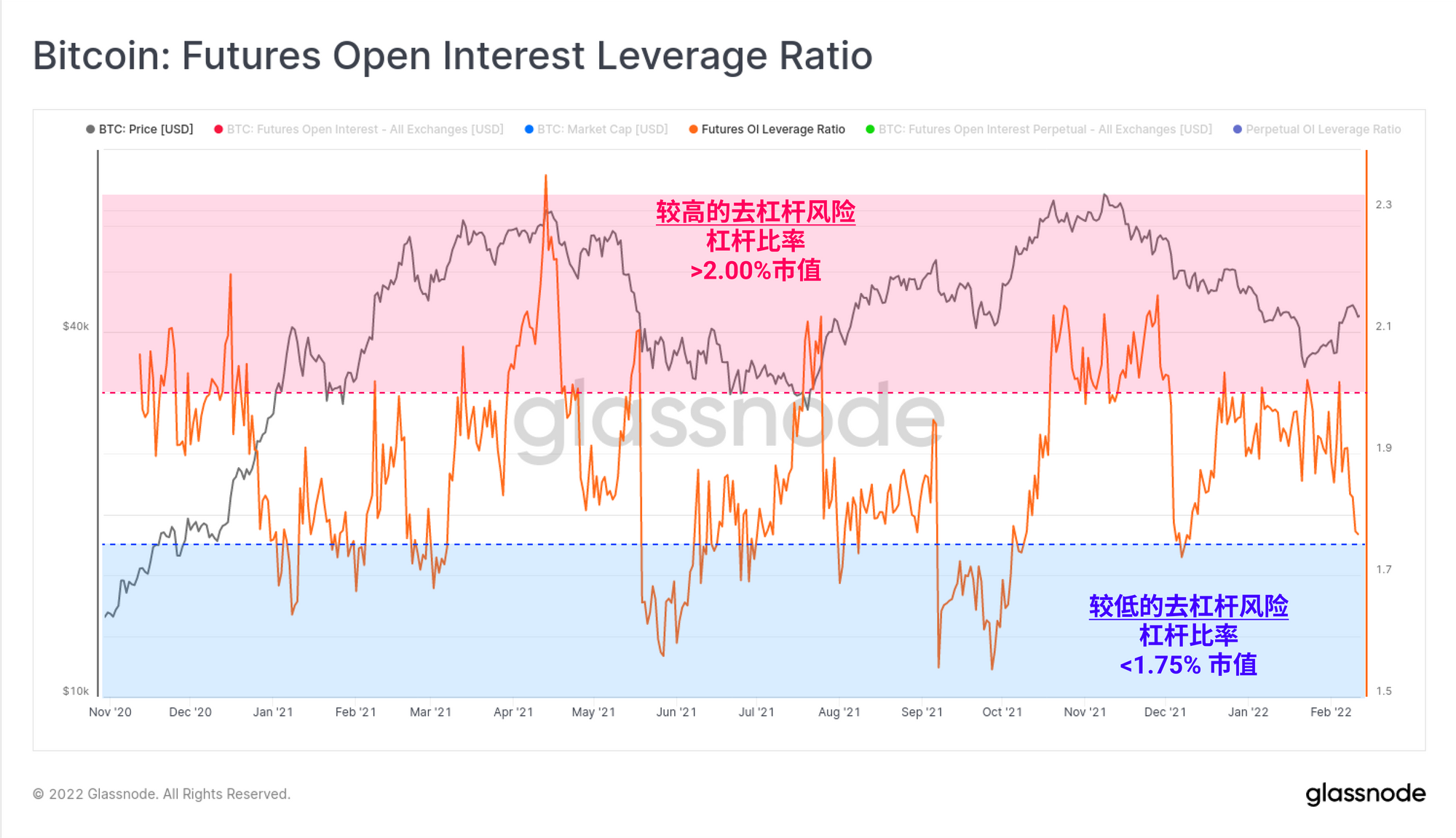 目前,期货未平仓合约总额已从总市值的2.0%降至1.76%。在整个2021年,这种规模的相对杠杆率已经达到市场相当稳定的范围,上一次达到这个范围是在21年12月4日的去杠杆化事件之后。