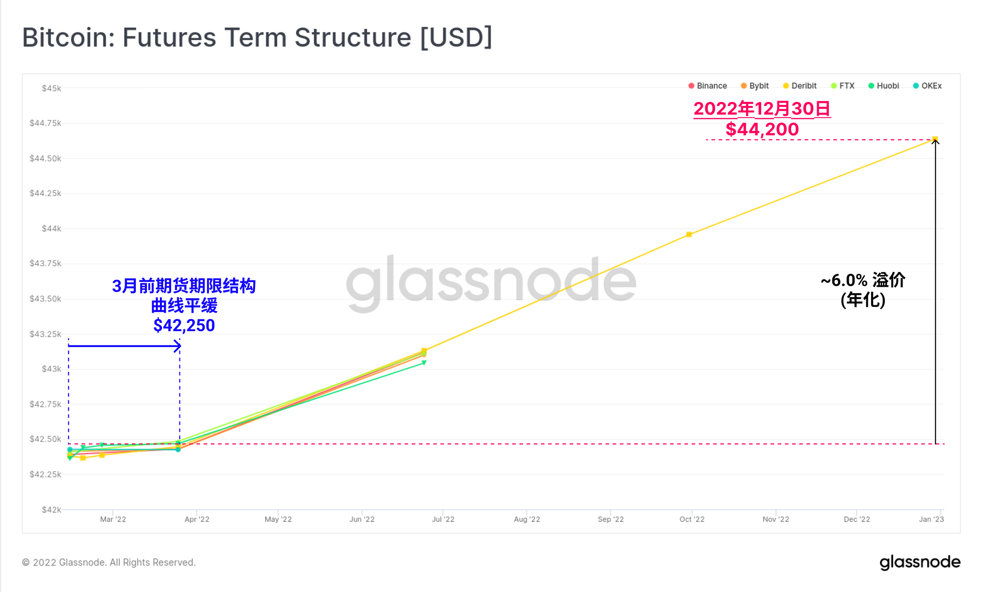 到2022年底的期货交易目前有6%的年化溢价,这表明市场对短期内出现疯狂的看涨冲动的预期还相当遥远。