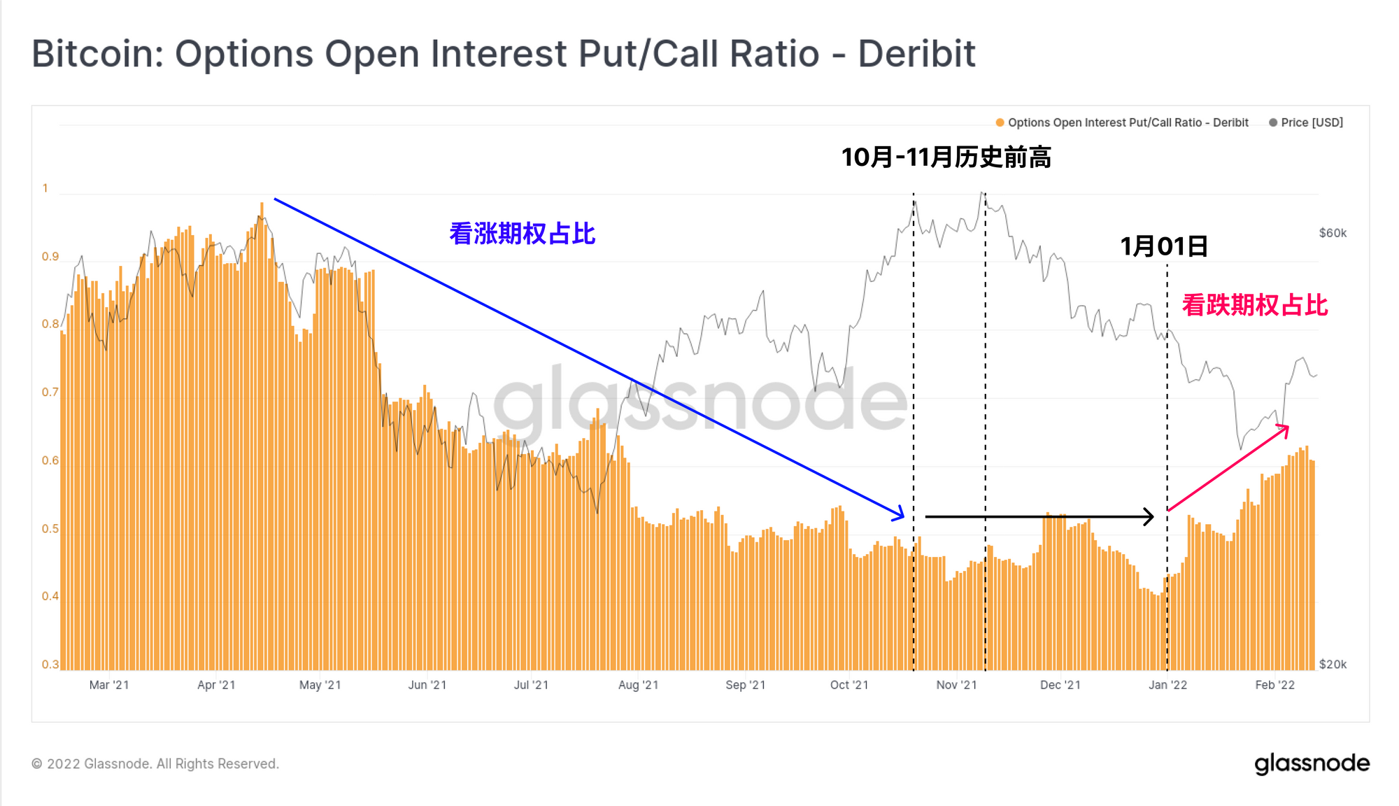 我们还可以看到交易员对保护性看跌期权的强烈偏好,看跌/看涨未平仓合约比率继续攀升。2021年10月和11月的历史前高之后,交易员从对投机性看涨期权的青睐到向保护性看跌期权的过渡非常明显,这表明了投资者情绪的新机制。