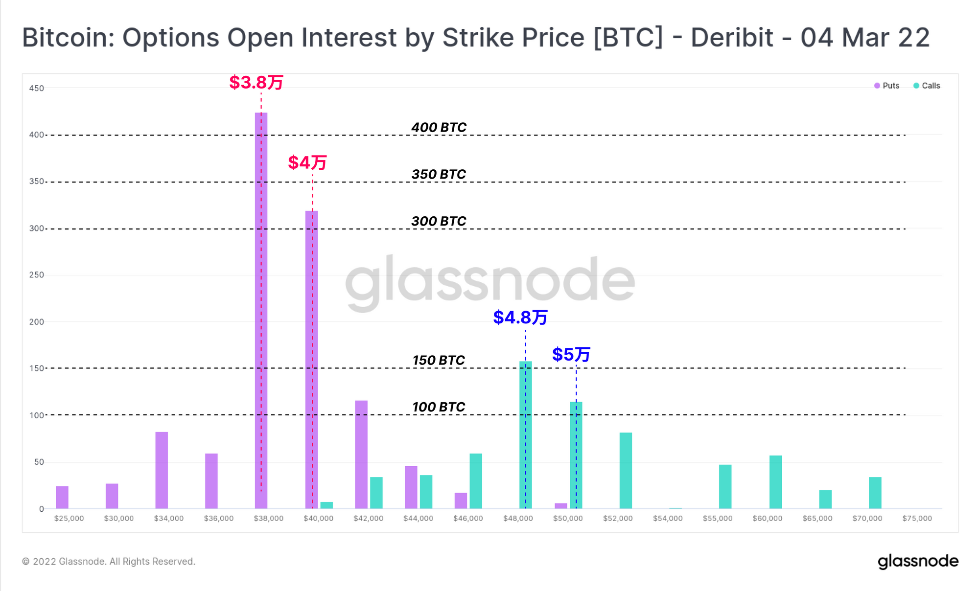 看一下3月4日到期合约的未平仓利息分布,看跌/看涨比率明显地处于高位。市场对行权价在3.8万至4万美元之间的看跌期权有明显的偏好,其未平仓利息是成交量最高的看涨期权的2.5倍以上,而后者的行权价在4.8万至5万美元之间。