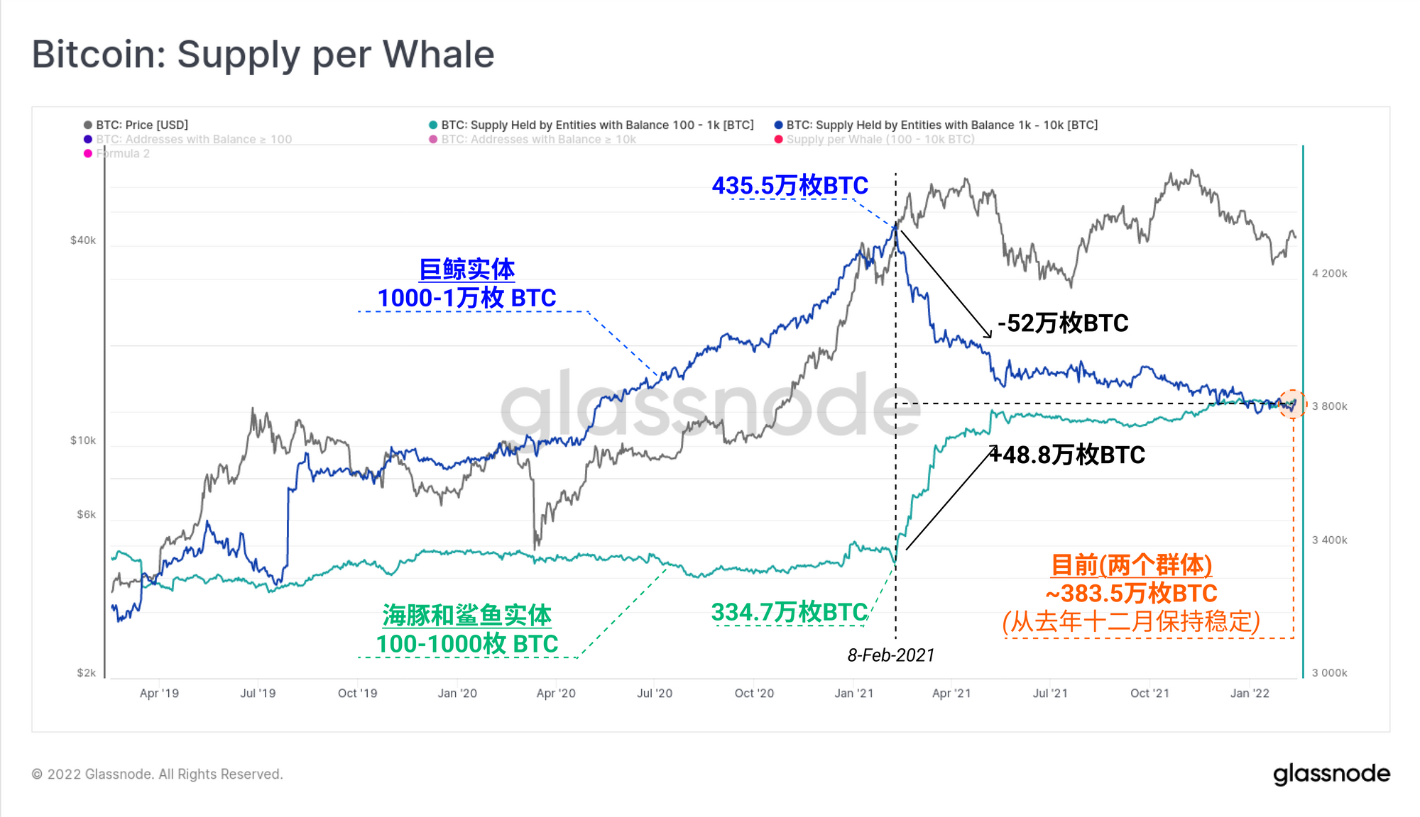 我们可以看到的是,在整个2021年,这两个群体所持有的总供应量的变化几乎是相等和相反的。随着持有1000-1万枚比特币群体的供应量减少了52万枚比特币,持有100-1000枚比特币群体的供应量增加了488万枚比特币。更精细的分析将揭示这些比特币是否被买入、卖出,或者只是被重新组合成更多的小价值UTXO。