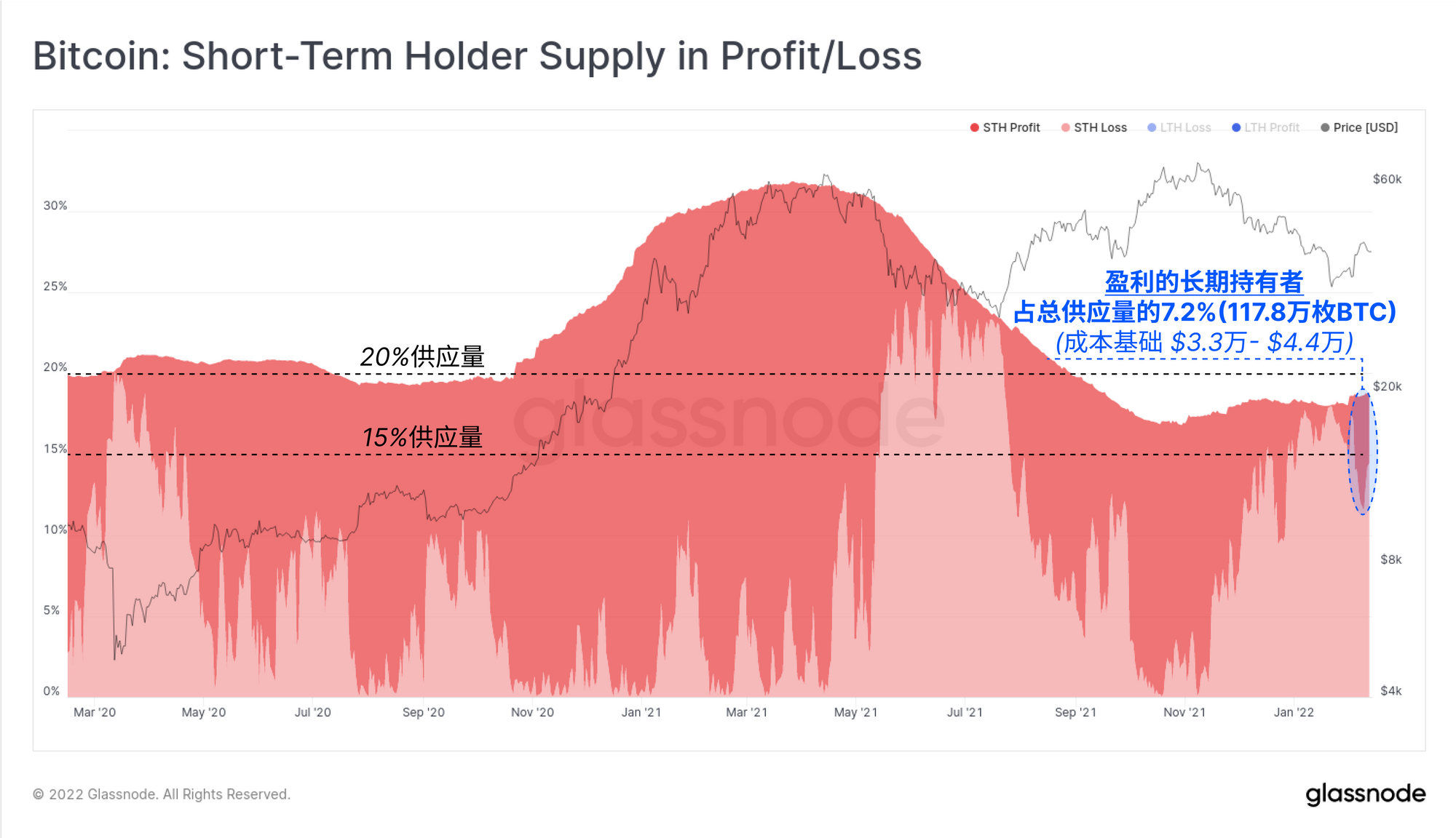 在这18.85%中,有7.20%的供应量在最近价格反弹到4.4万美元以上后,扭亏为盈,成为未实现的利润。这表明,当价格在3.35万美元和4.4万美元之间时,约有117.8万枚比特币被卖出(假设已经换手)。换句话说,在过去的三周里,在交易所之外持有的7.2%的比特币供应被重新积累起来,提供了在当前价格范围内的潜在需求的迹象。