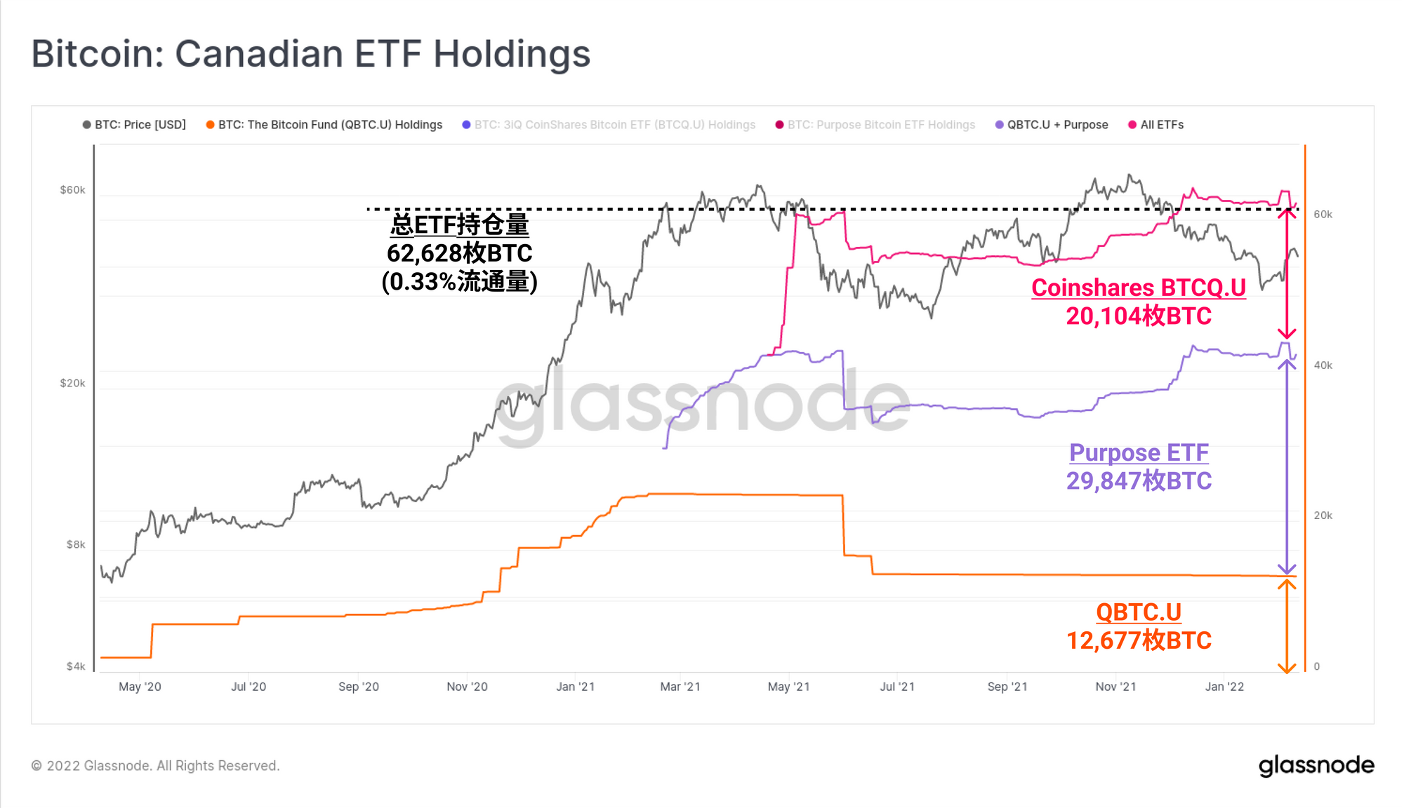 这些ETF现在总共持有62628枚比特币,占流通量的0.33%,其中Purpose ETF占总量的47.6%。