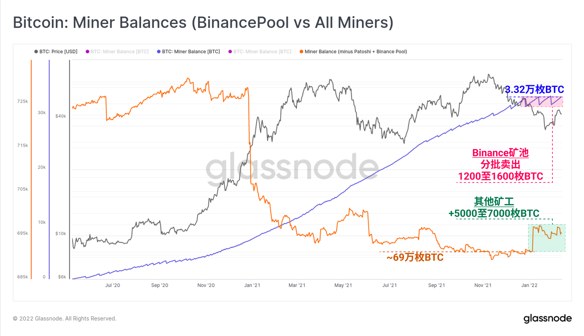 • 自2020年中以来,BinancePool(蓝色)一直是一个巨大的已挖出比特币的净积累者,已经积累了3.32万枚的储备。然而,在整个2022年,与BinancePool相关的矿工一直在定期地卖出1200至1600枚比特币。