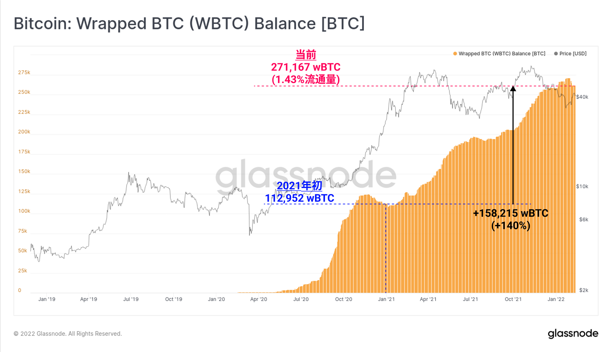 将比特币转成wBTC在以太坊生态系统内使用的需求一直令人印象深刻,现在已经吸收了271167枚比特币,超过流通供应量的1.43%。wBTC供应量自2021年开始扩大了140%,增长了15.82万枚比特币。