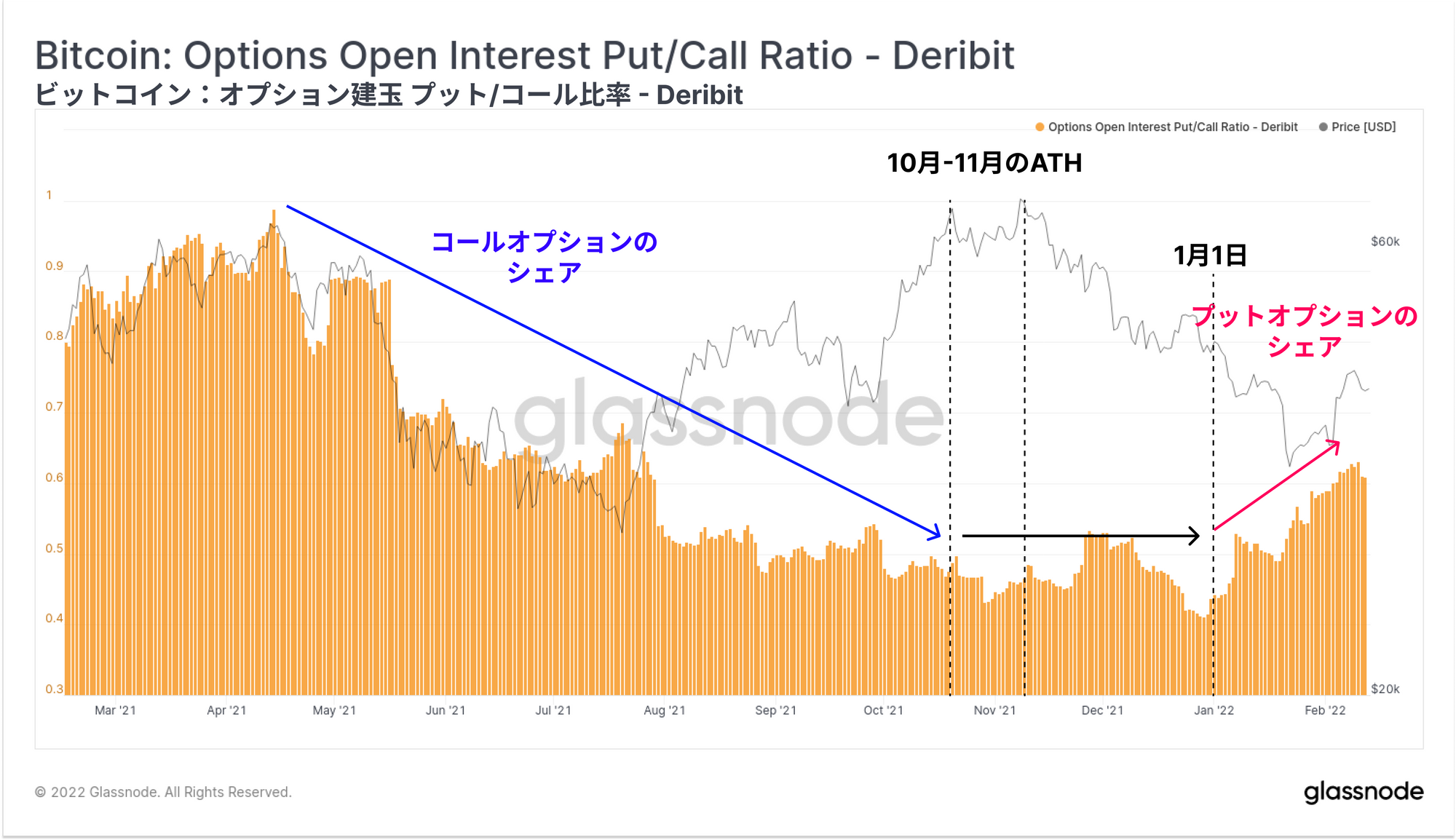 世界的なマクロ経済の逆風が強まる中、ビットコインの投資家はリスクを回避している。特に、トレーダーは3月に予定されているFRBの利上げを注視し、投機的なコールよりも保護的な保険(プットの買い)を選択した。