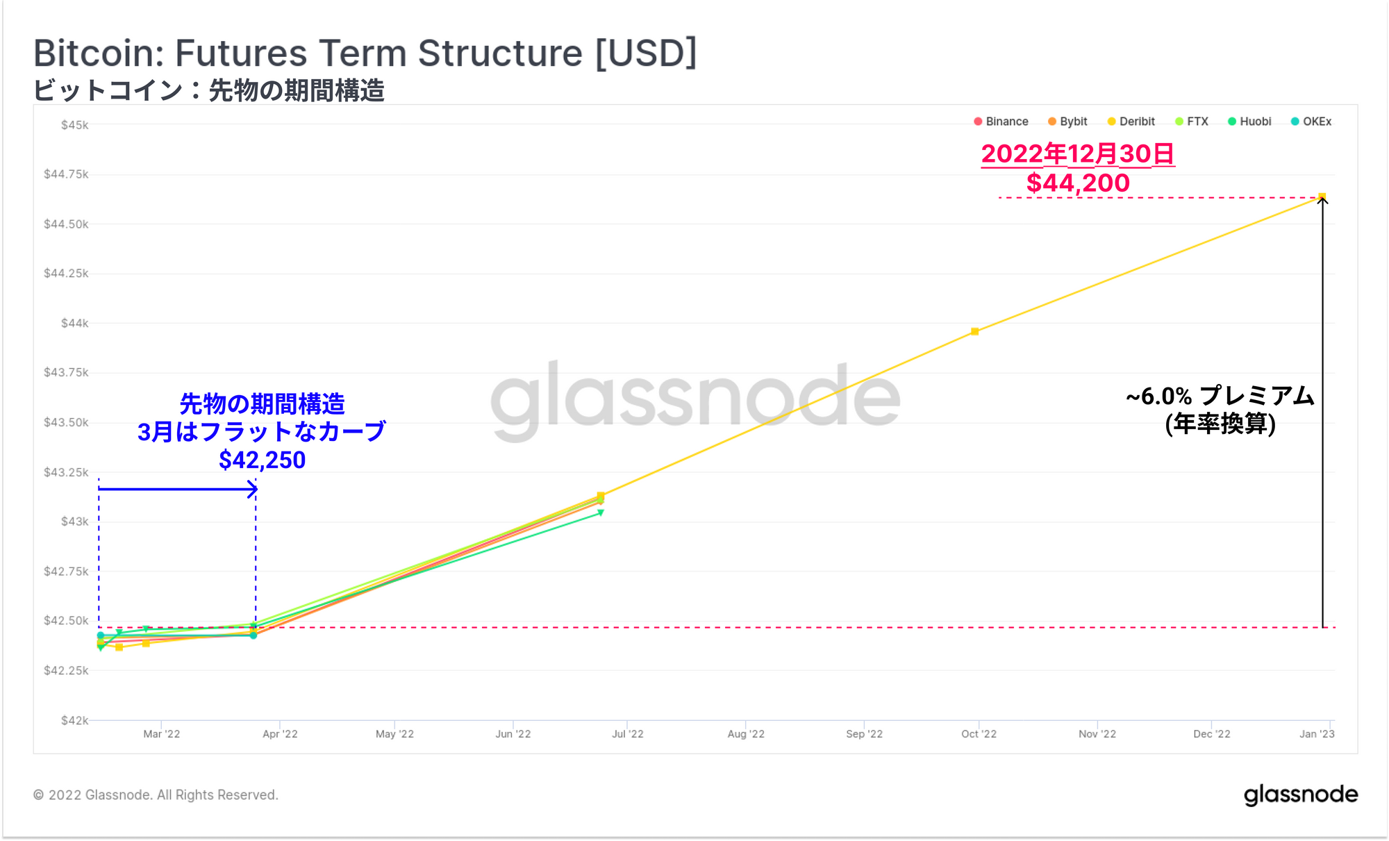 2022年末までの先物は現在、年率6%という非常に控えめなプレミアムで取引されており、市場がすぐにでも強気一辺倒になるとは到底思えない状況であることを示唆している。