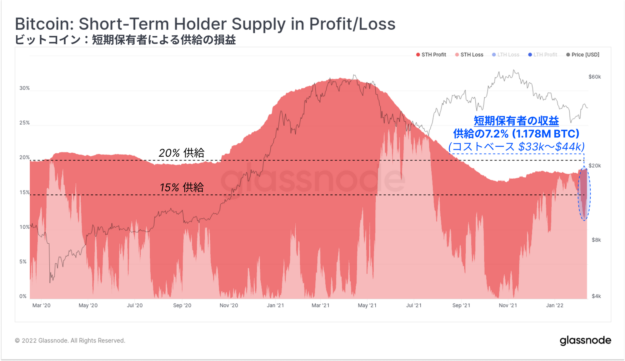 短期保有者(STH、保有期間が155日未満のコイン)は、現在、取引所準備金以外の供給量の18.85%を保有している(注:長期保有者供給量+短期保有者供給量+取引所準備金 ≒流通供給量)。