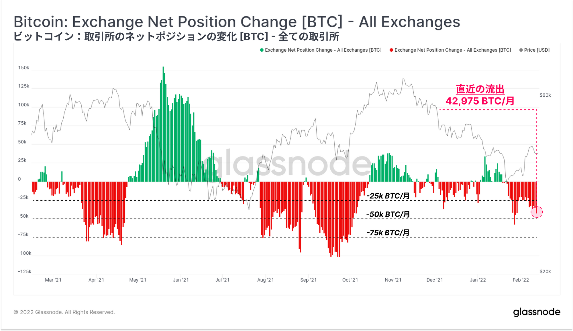 しかしながら、2021年から22年にかけてこれらのウォレットコホートから移動したコインは、正味で-32k BTCになる。これは、1年間の再配分プロセスで考えると、間違いなく小さなコイン量であり、また現在における取引所の流出の月間レート(42.9k BTC/月)と比較しても相関している。