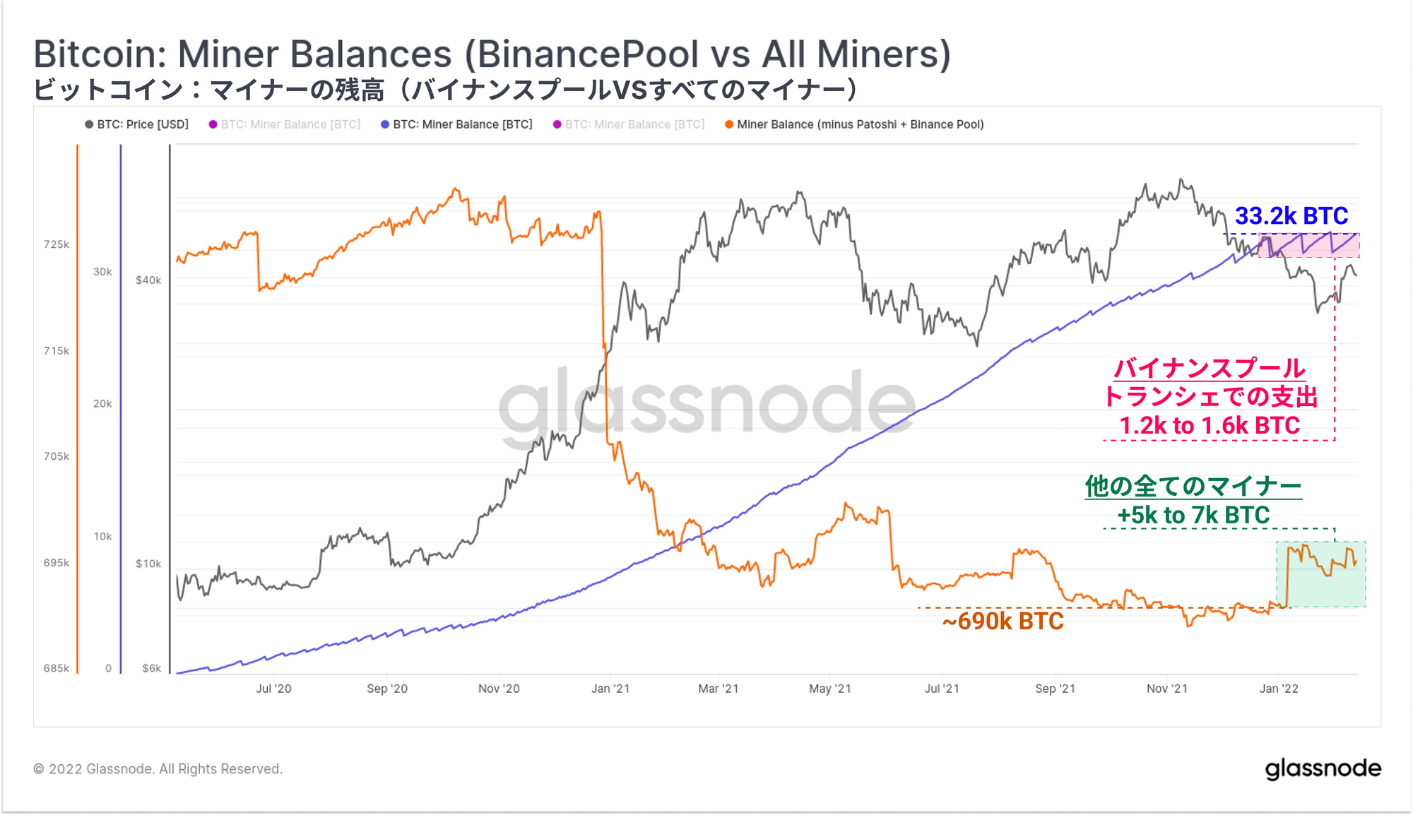 ・他のすべてのマイナーとプール(オレンジ色)は、2020-21年を通してヘビーな売却者であり、総残高は昨年10-11月では約690k BTCと数年来の低水準に達している。このマイナーのコホートは、Binanceプールによる最近の売却に反して2022年に5k~7k BTCを総資産に加えた。
