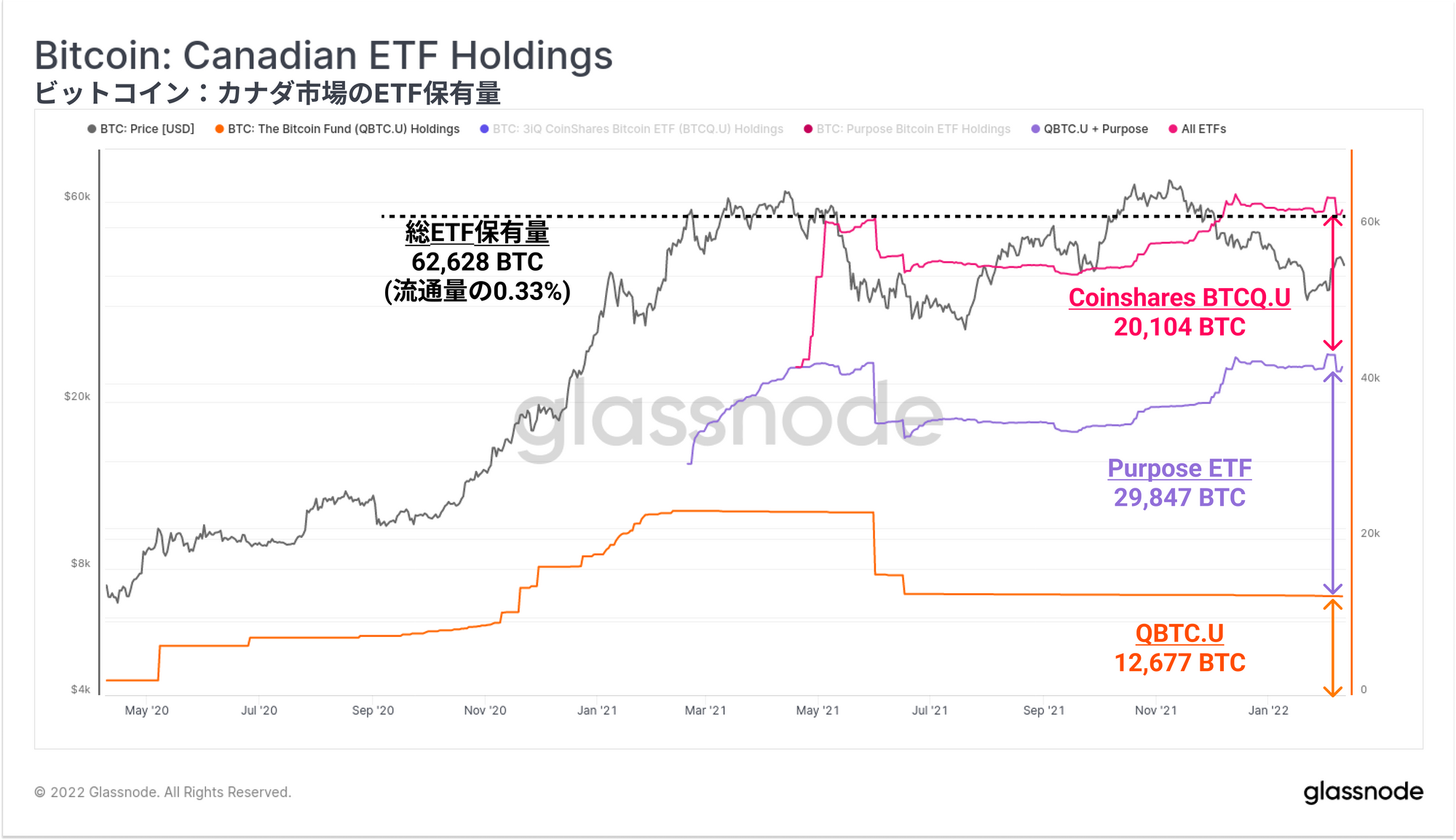 これらのETFを合計すると、現在、合計62,628BTCを保有しており、流通量の0.33%に相当するとともに、Purpose ETFは全体の47.6%を占めている。