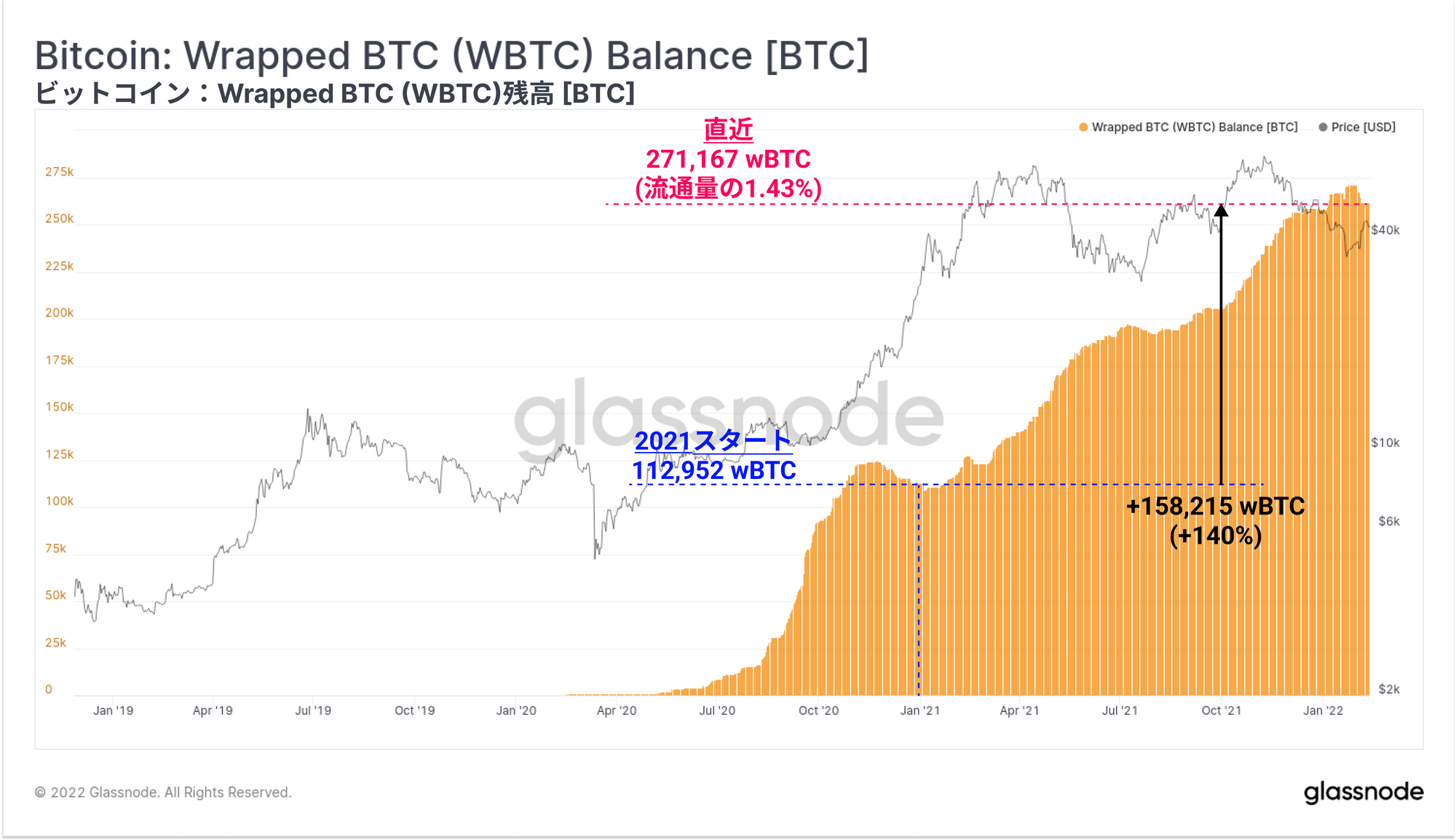ビットコインをイーサリアムのエコシステム内で使用するためにwBTCへラップすることは目覚ましいほど高い需要があり、現在、流通供給量の1.43%以上である271,167BTCを吸収している。 wBTCの供給量は2021年の開始以来140%拡大し、158.2kBTC増加した。