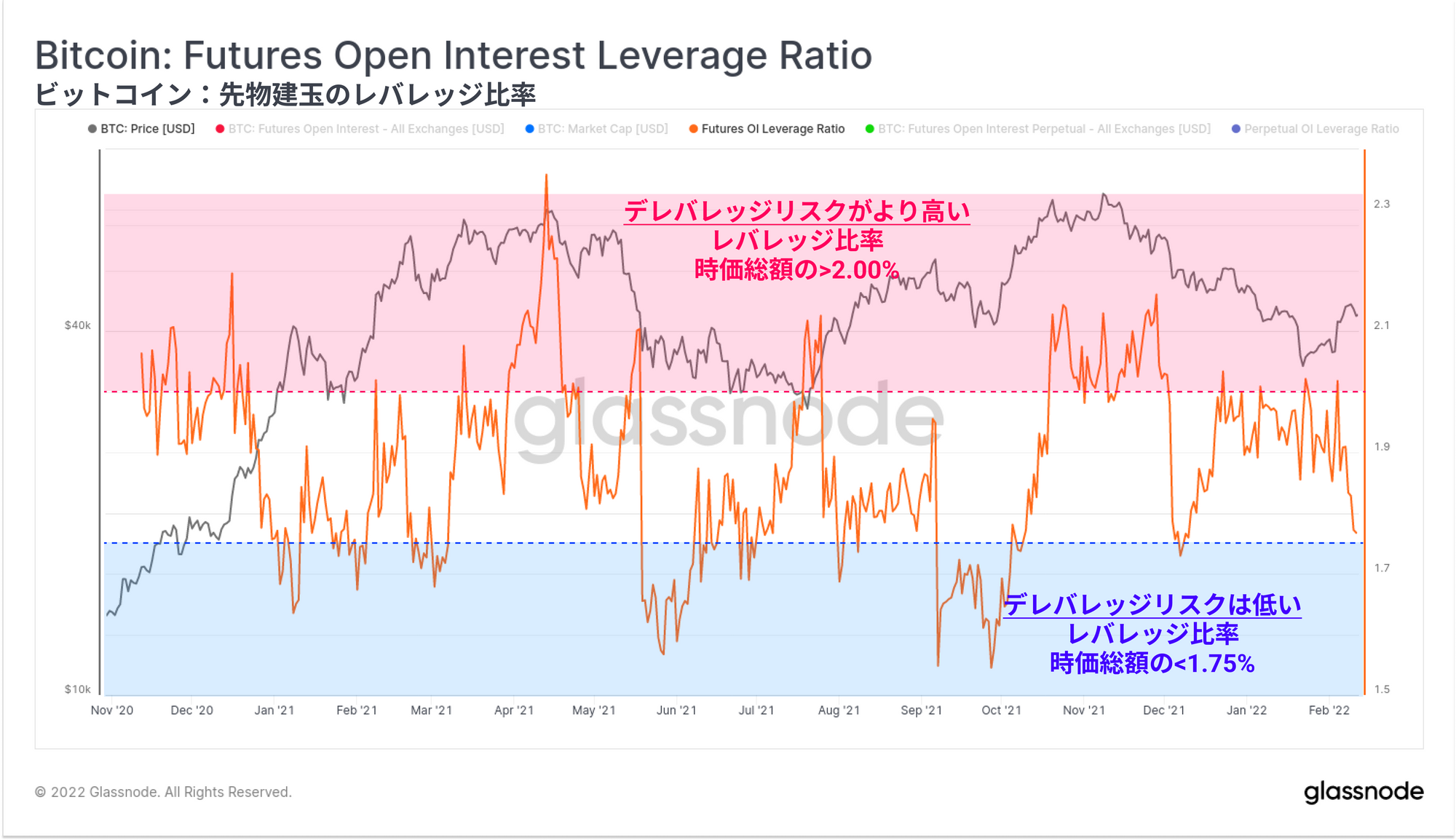 現在、先物建玉は時価総額の2.0%から1.76%まで減少している。この規模の相対的なレバレッジは、2021年を通じて市場にとってかなり安定的な範囲であることを示しており、2021年12月4日のデレバレッジイベントの後に最終的に到達したレベルである。