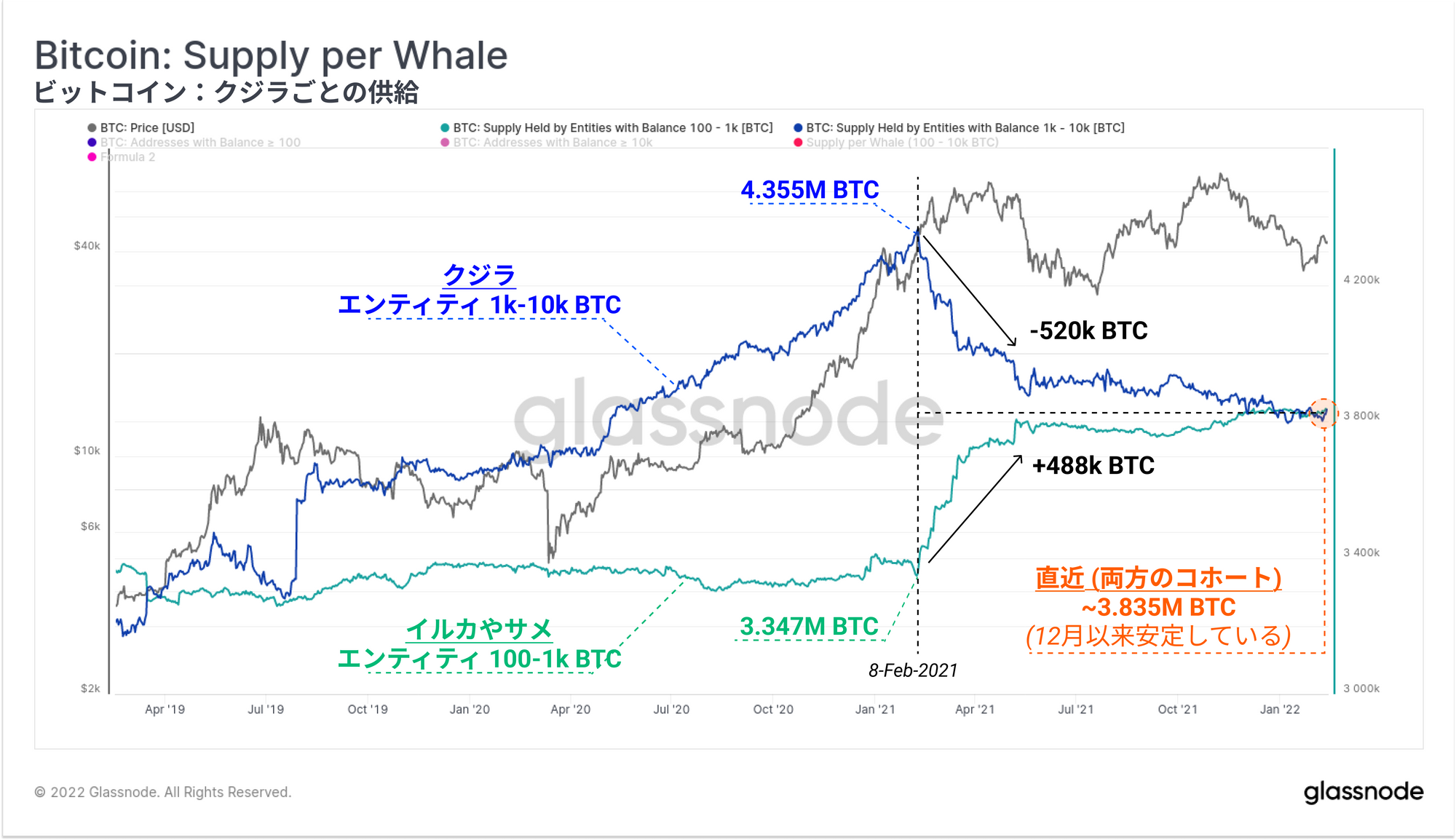 2021年を通じて、この2つのコホートで保有される総供給量はほぼ同等で正反対の変化をしていることがわかる。1k~10kのコホートが保有する供給量が520kBTC減少する一方で、100~1kのコホートが保有する供給量は488kBTC増加している。より細かい分析により、これらのコインが売買されたのか、あるいは単に、より値の小さいUTXOが大きな集合体として再構成されたのかが明らかになる。