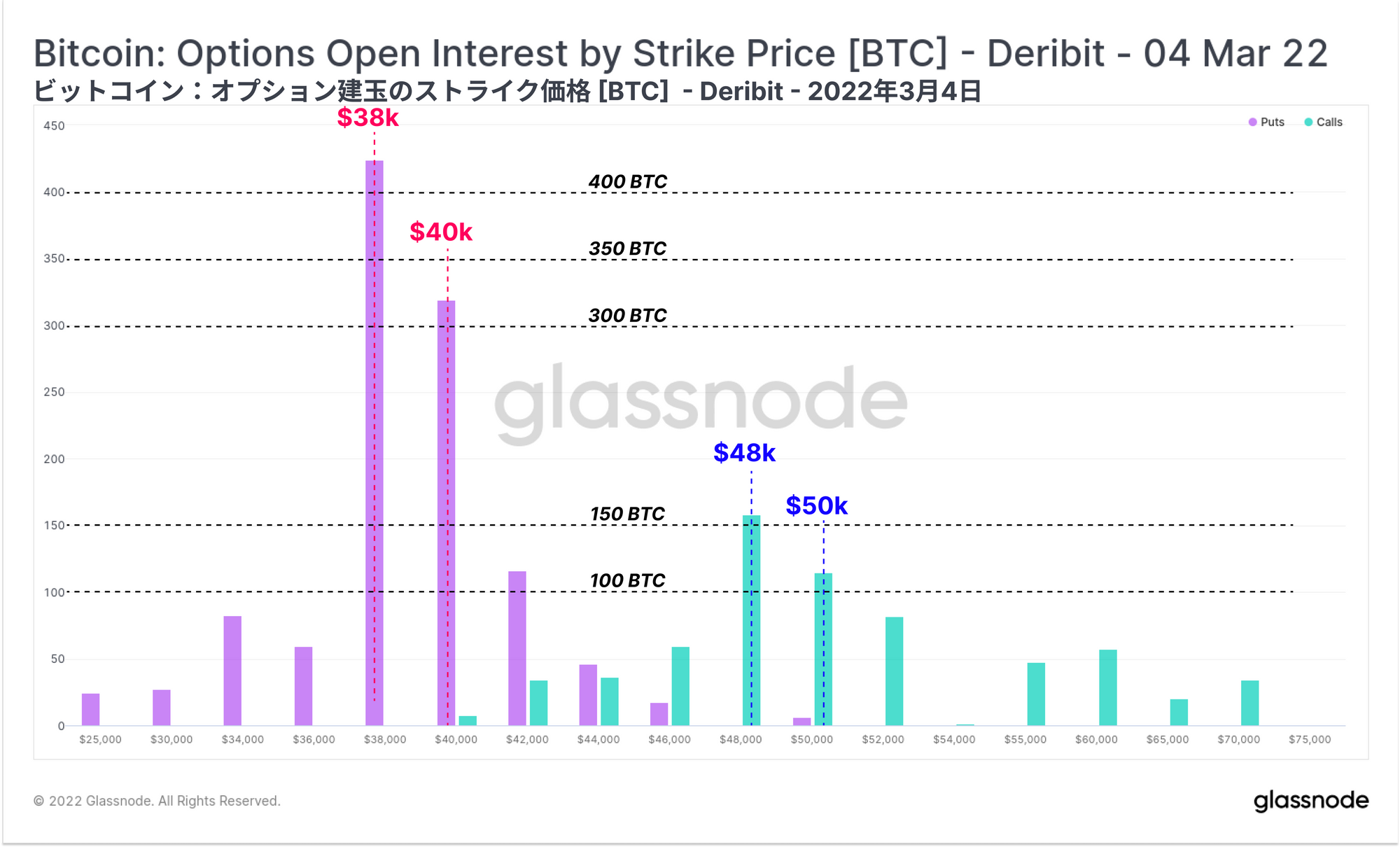 3月4日限の建玉分布を見ると、プット/コールの優位性が高まっていることが明らかである。市場では、3万8,000ドルから4万ドルの権利行使価格のプットが明らかに選好されており、最も取引高の多い4万8,000ドルから5万ドルの権利行使価格のコールオプションの2.5倍以上の建玉が保有されている。