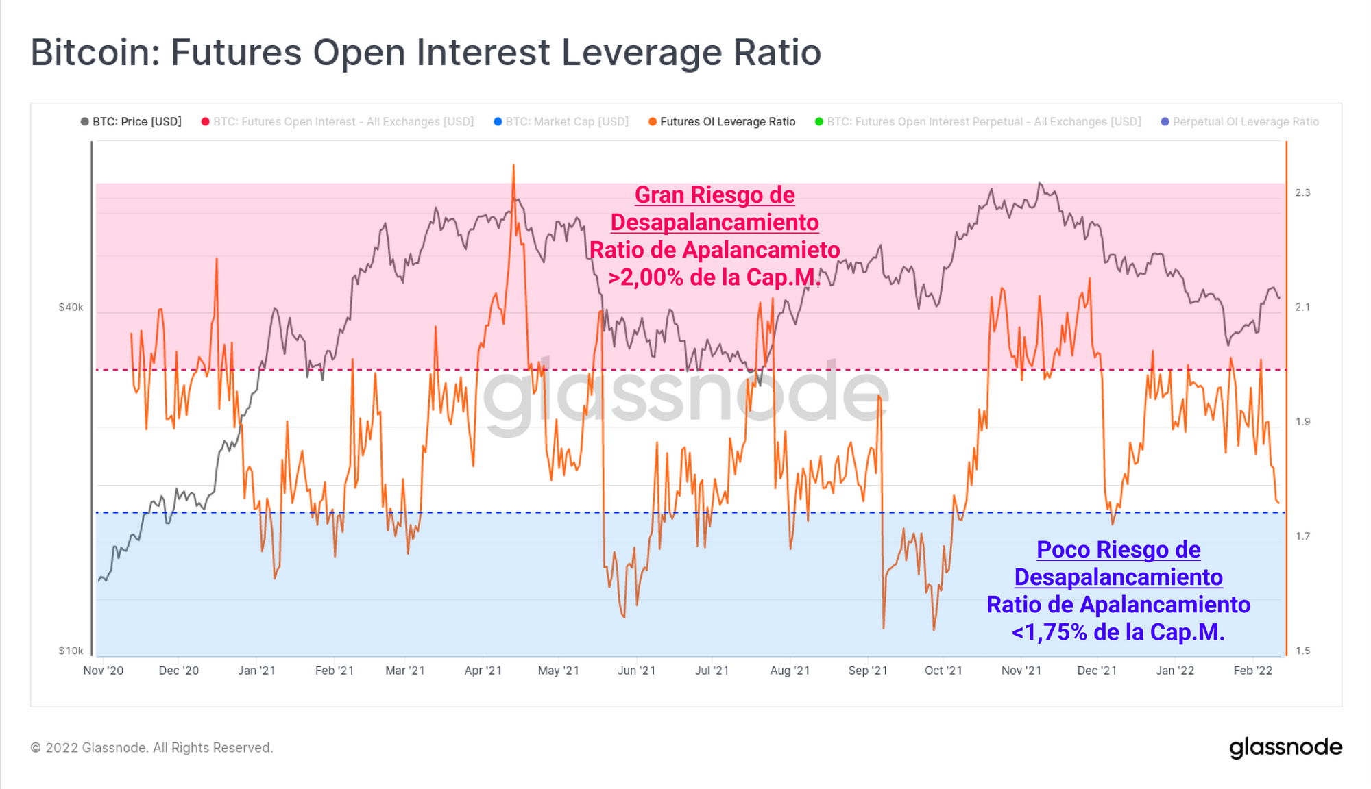 También ha habido un notable desapalancamiento a lo largo y ancho de los mercados de futuros esta semana, aunque no ha venido de la mano de las famosas cascadas de liquidaciones que marcaron tantos momentos del pasado 2021. El propulsor parece ser esta vez un comportamiento voluntario por parte de los propios traders, quienes han optado por cerrar sus posiciones, lejos de verse forzados a vender a causa de liquidación o en respuesta a una acción de precio demasiado volátil. El mercado parece estar soltando lastre en forma de riesgo y también disminuyendo el apalancamiento como reacción al sinfín de macro incertidumbres.