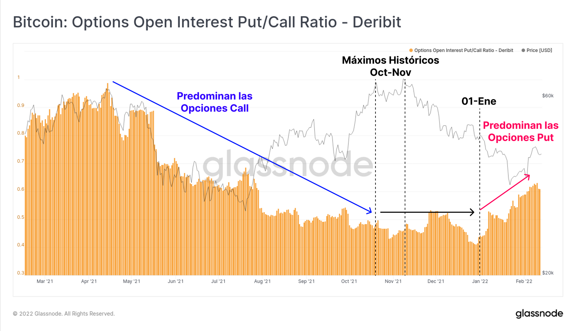 Observamos además una gran preferencia por la protección de las opciones put, con un ratio de los contratos en abierto Put/Call que sigue escalando. La transición en la cantidad de traders que apostaban antes por especular con opciones call, y que ahora apuestan por el cobijo de las opciones put es más que clara, especialmente desde que se alcanzaron los máximos históricos de octubre y noviembre, indicativo de un nuevo régimen de sentimiento inversor.