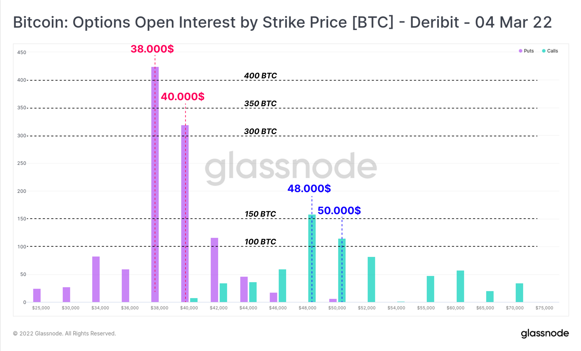 Esta mayor dominancia entre los put/call se hace también aparente cuando nos fijamos en la distribución de los contratos en abierto de los contratos que expiran el 4 de marzo. Está clara la preferencia del mercado por los puts con especial hincapié entre los 38.000 y los 40.000$, rango que acapara más del doble de contratos en abierto que los siguientes precios de interés, entre los 48.000$ y los 50.000$.