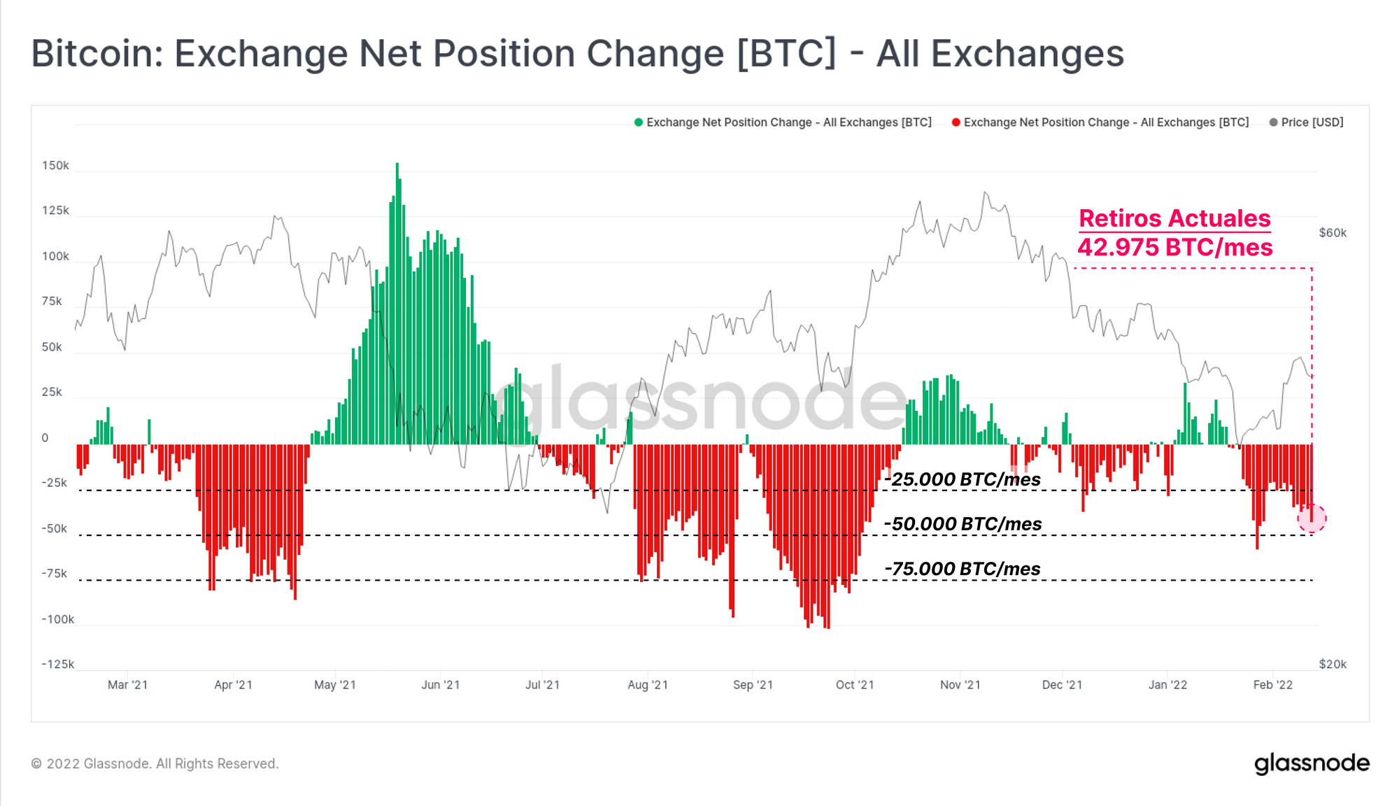 Aunque sea como sea, el transcurso del 2021-22 nos deja con -32.000 BTC que migraron desde este conglomerado de carteras. Sin duda se trata de un volumen monetario pequeño cuando lo repartimos a lo largo de un periodo de distribución de más de un año, y también es pequeño relativo al ritmo de retiros de los exchanges que se dan mensualmente (42.900 BTC/mes).
