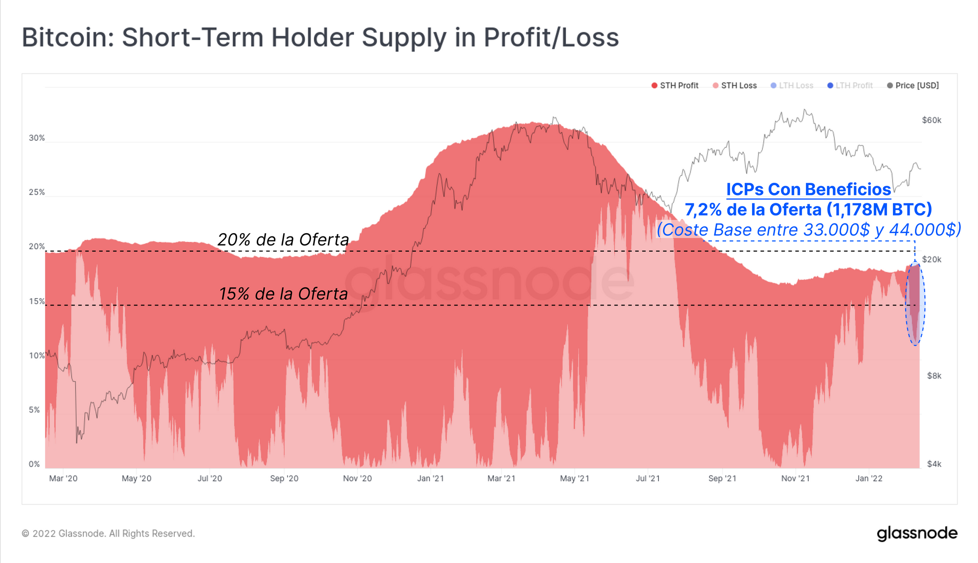 A rasgos generales, las señales que podemos extraer del precio de los mercados de derivados son de índole protectora, apalancamiento conservador, y un acercamiento cauteloso ante las tormentas que se avistan en el horizonte. Basándonos en tanto el precio de los futuros como el de las opciones, en general la incertidumbre parece concentrarse al rededor del impacto que puedan tener las subidas de los tipos que imponga la Reserva Federal, y que se espera que lleguen hacia el mes de marzo. A continuación, vamos a revisar qué nos cuentan las métricas del blockchain para aunar todas estas observaciones con el sentimiento inversor presente en los mercados spot.