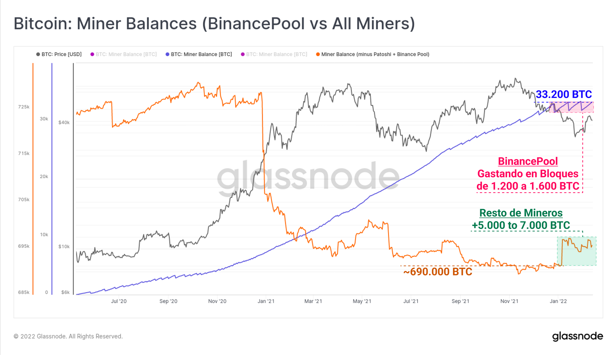 - El resto de mineros y pools (naranja) han incurrido en una distribución mucho más pronunciada en el 2020-21, con un balance agregado que alcanzó nuevos mínimos multi-anuales de en torno a los 690.000 BTC entre octubre y noviembre del año pasado. Contrastando con los gastos recientes por parte de BinancePool, este grupo minero ha conseguido sumar entre 5.000 y 7.000 BTC al agregado de sus reservas en lo que llevamos de 2022.
