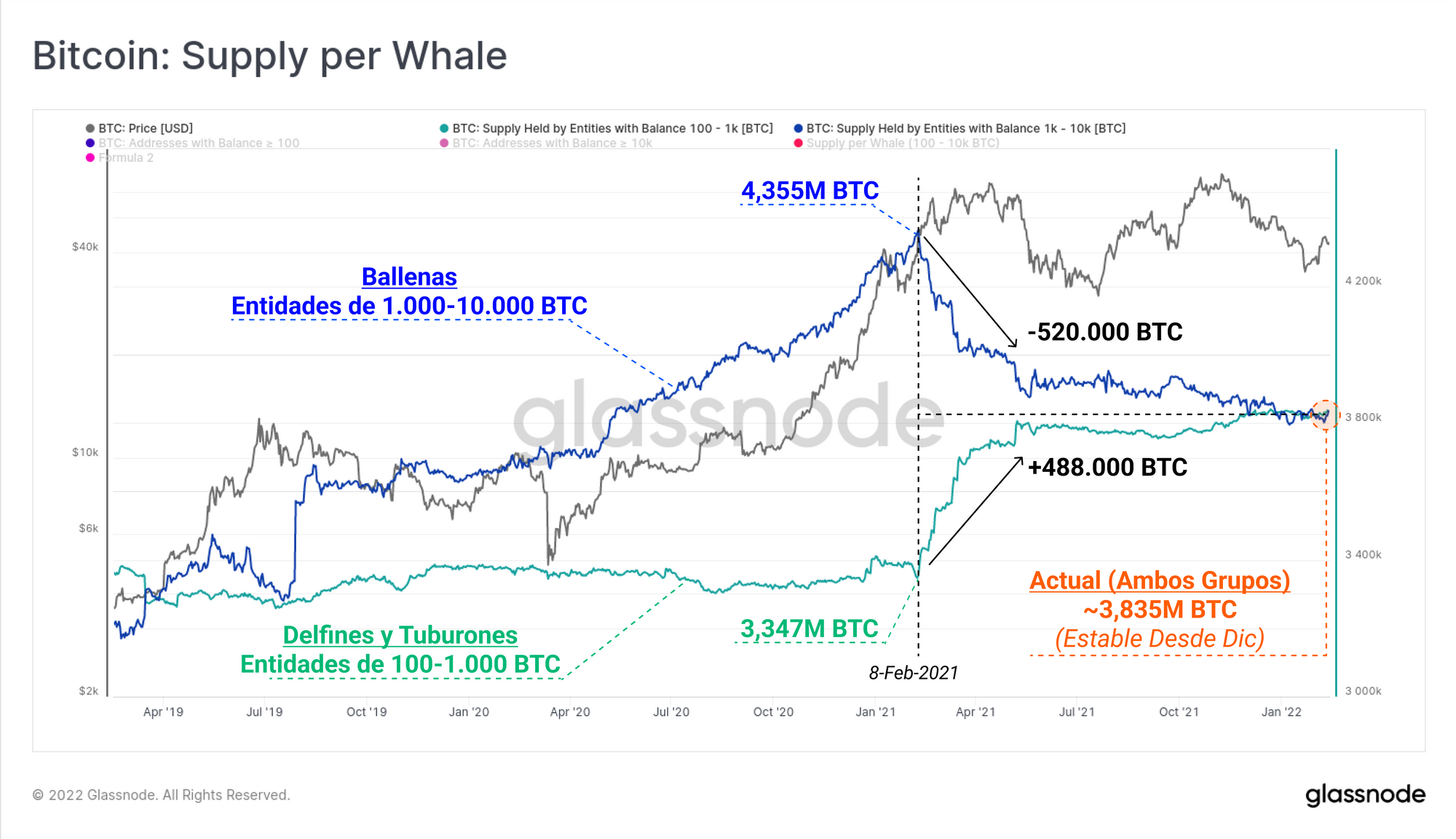 Lo que encontramos es un cambio prácticamente igual pero opuesto en la oferta total en posesión de estos dos grupos a lo largo del 2021. Mientras que la oferta perteneciente al grupo con entre 1.000 y 10.000 descendió en 520.000 BTC, la oferta de las carteras con entre 100 y 1.000 aumentó en 488.000 BTC. Un análisis más detallado nos revelaría si estas monedas se compraron, vendieron, o simplemente fueron reconfiguradas entre un mayor número de transacciones de menor tamaño.