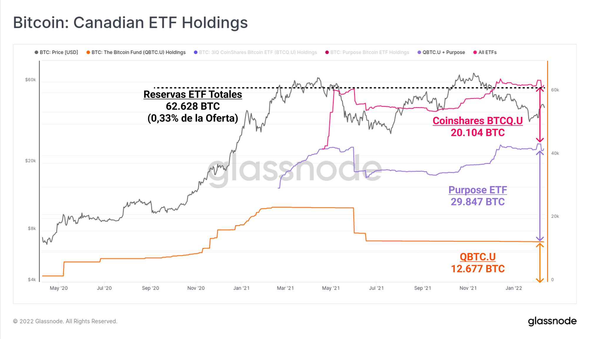 Entre todos, estos ETFs acaparan un total de 62.628 BTC, el equivalente al 0,33% de la oferta en circulación, y Purpose ETF suponiendo el 47,6% de ese total.