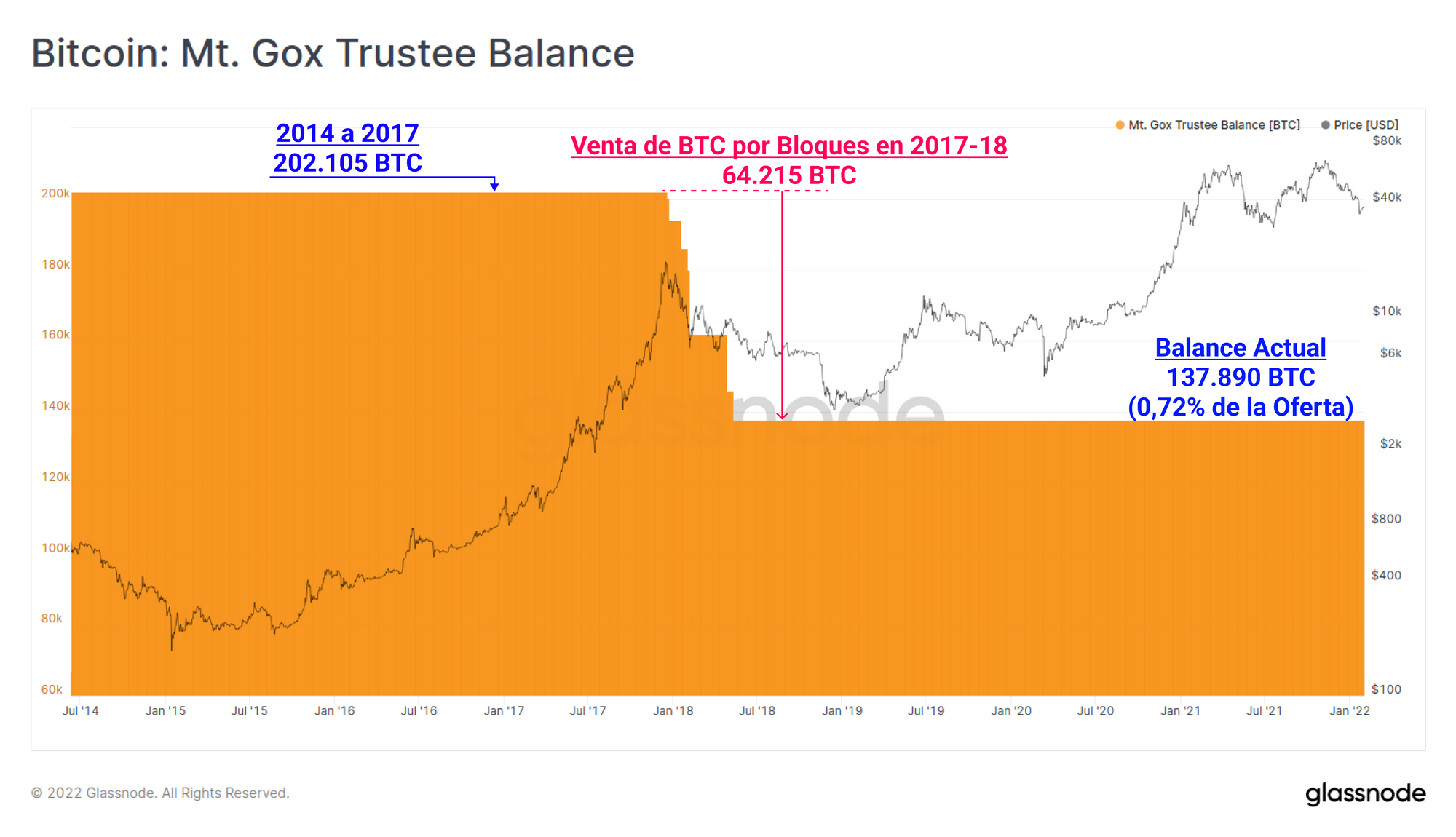 Por último, mientras continúan los procedimientos de la larga rehabilitación del Mt Gox, las métricas que representan el balance monetario de Mt Gox Trustee, Nobuaki Kobayashi, ya están en vivo. Tras una serie de ventas en bloques durante el 2017-18, el balance total de monedas bajo el control de Mt Gox Trustee se sitúa actualmente en 137.890 BTC, el equivalente al 0,72% de la oferta en circulación. Esta métrica responderá acorde en caso de que el Trustee gaste o mueva cualquiera de las monedas en su poder.