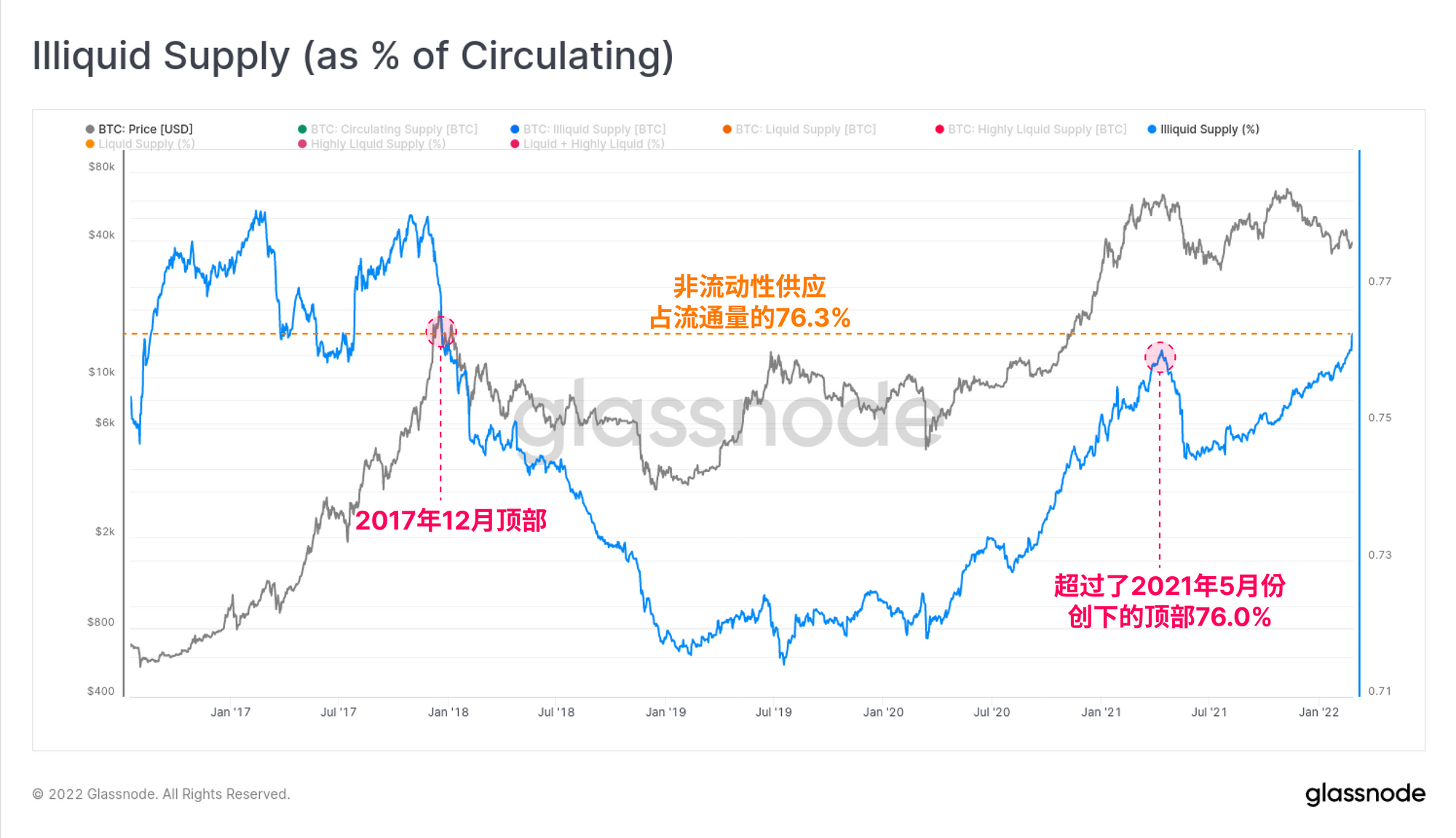 至于非流动供应相对于流通供应的比例,现在已经超过了2021年5月的峰值,达到了76.3%。 这个指标现在已经回到了与2017年市场顶部相同的水平,扭转了长达四年的比特币钱包流动性的增长趋势。 然而,请注意,这两种情况都是在重大抛售事件之前发生的,因此,这些比特币是否真的被存储在冷钱包中,还有待观察。