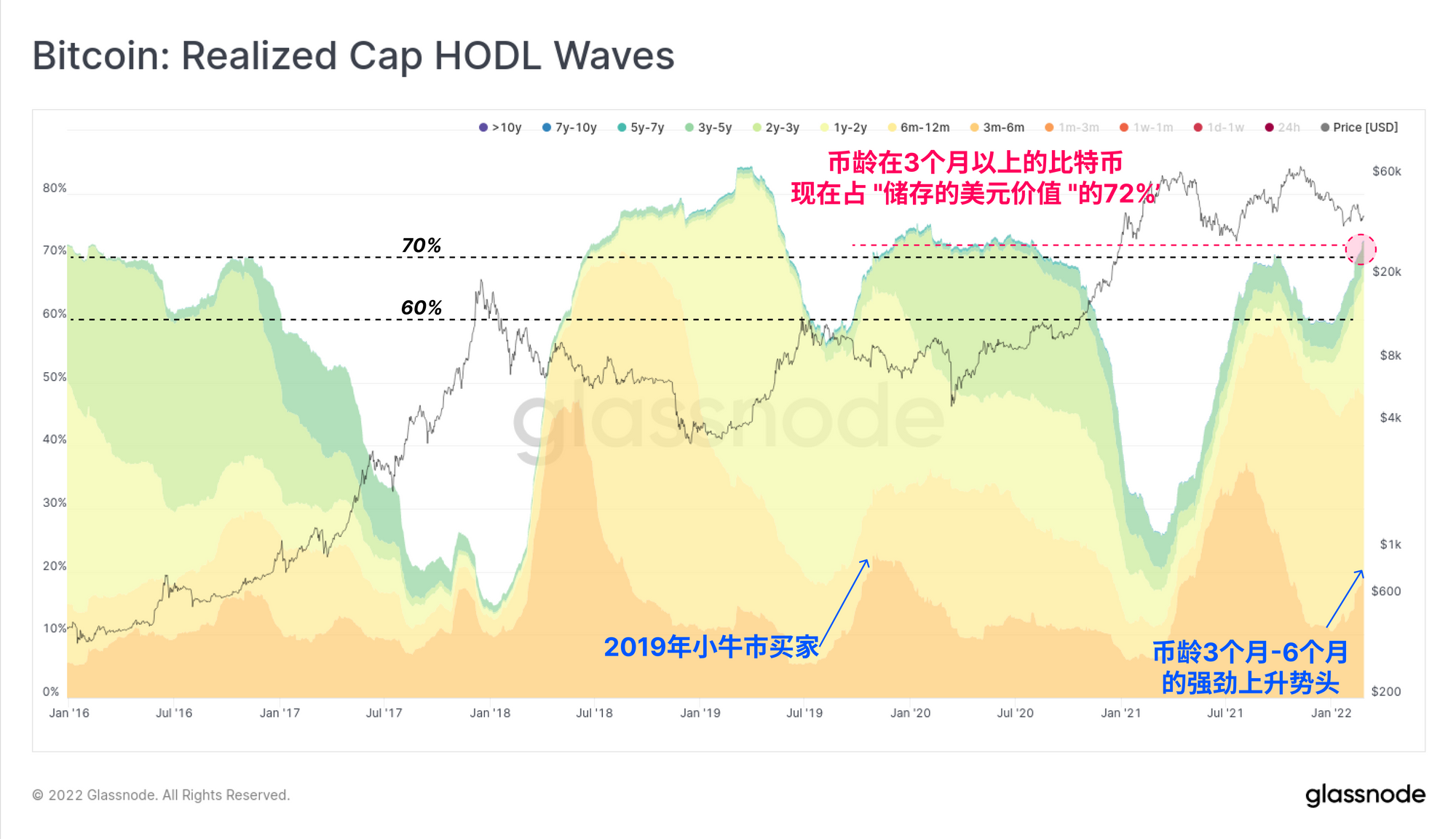 类似的情况是,币龄在3个月以上的实现市值囤币波正在被推升至72%的局部新高。 这意味着 "储存在比特币中的美元价值",其中币龄大于3个月的比特币占比达到了72%。