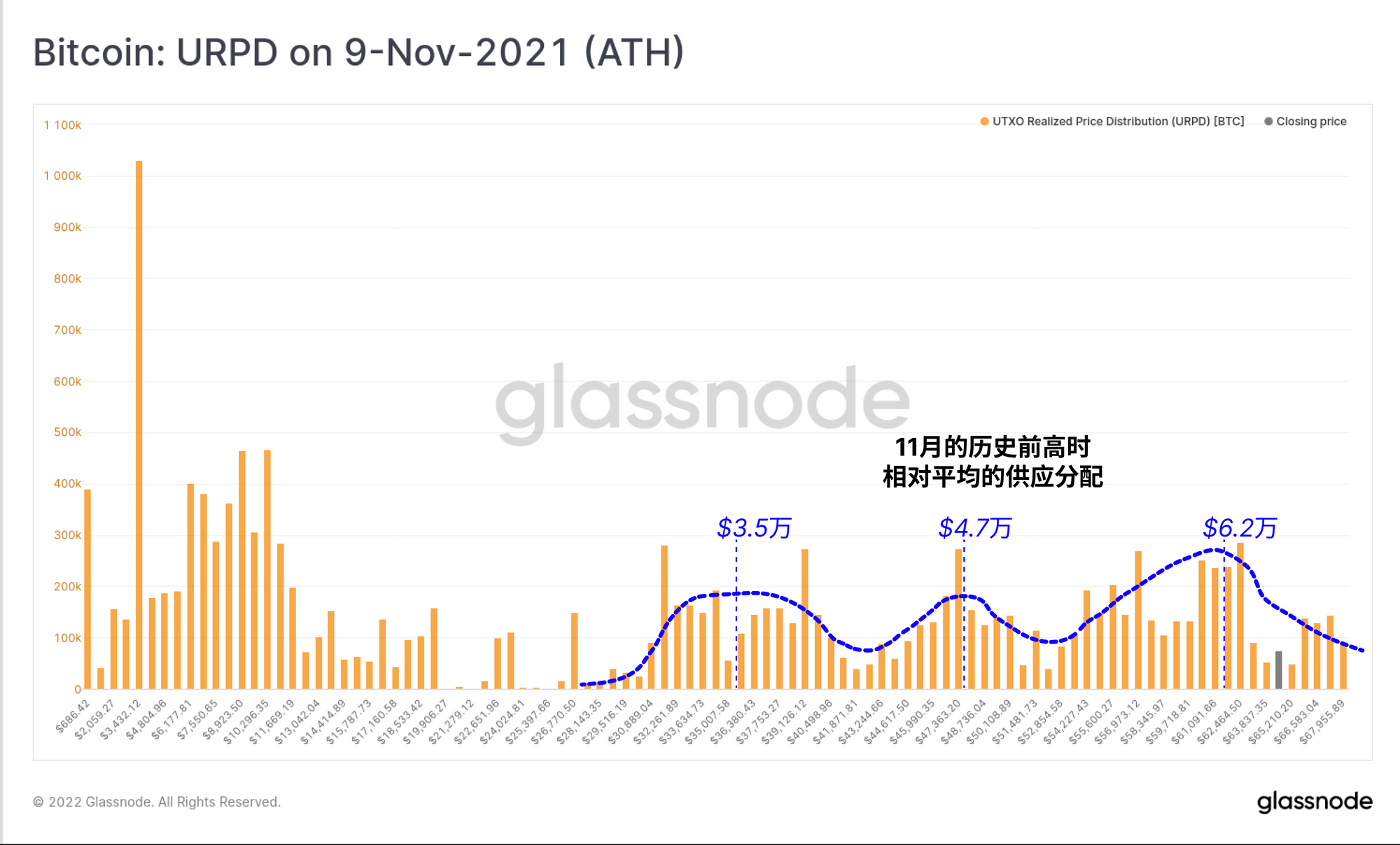 比特币目前处于市场调整阶段,我们可以看到在2021年7月的反弹,一直到11月的历史前高过程中,市场建立了一个非常均匀的比特币供应分布。 这种分布表明了以下情况: