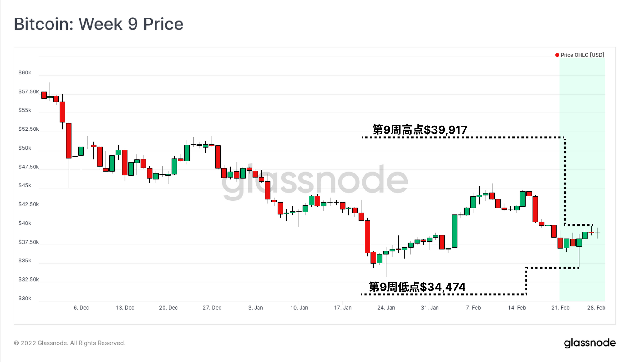 由于俄罗斯和乌克兰之间爆发了武装冲突,全球市场面临一个非常令人冷静的一周。 作为一种全球宏观资产以及7天24小时交易的市场,比特币的价格反应相当波动。 本周市场交易跌至34,474美元的低点,然后迅速回升至39,917美元的高点。