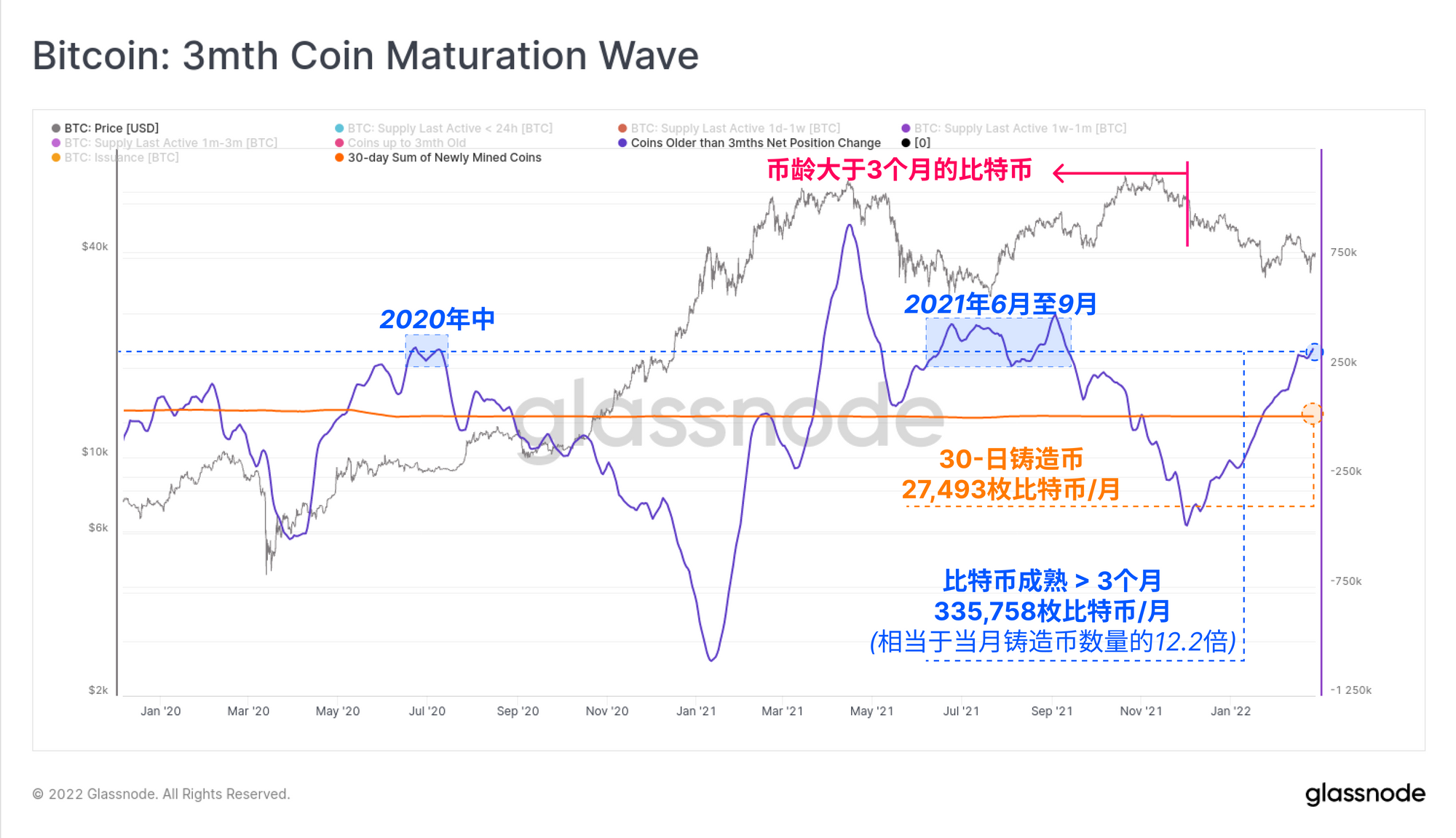 最后,为了证明在过去3个月里有多少币量被囤币党吸收,我们看一下在过去30天里币龄增长至3个月以上的比特币数量。