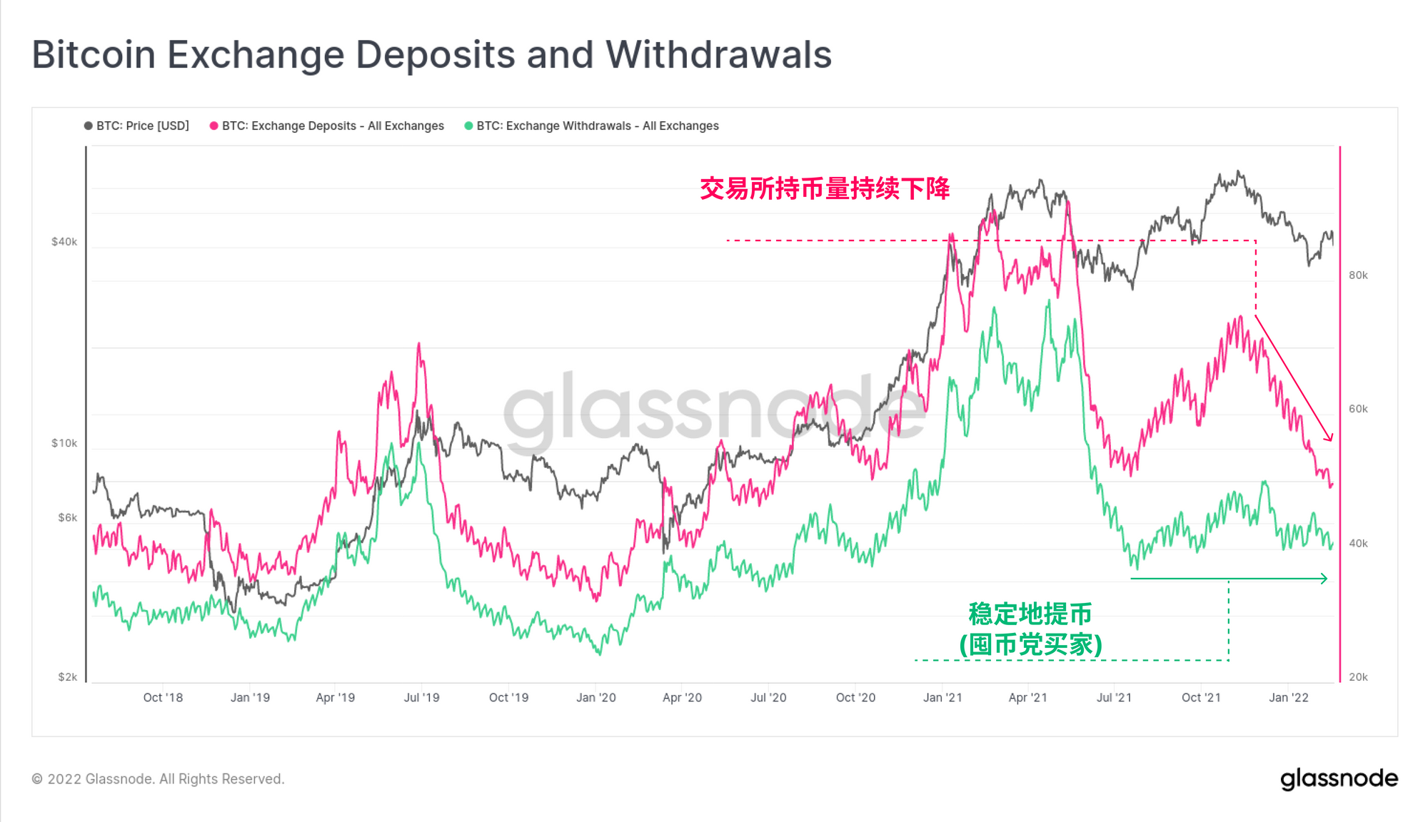 我们还观察到交易所存币的投资者数量持续下降(粉红色),从11月的7.4万枚/天,下降到今天的4.1万枚/天。 同时,交易所的提币量非常稳定地保持在4万至4.8万枚BTC/天左右,这再次表明,无论行情好坏,都有大量的囤币党提币。