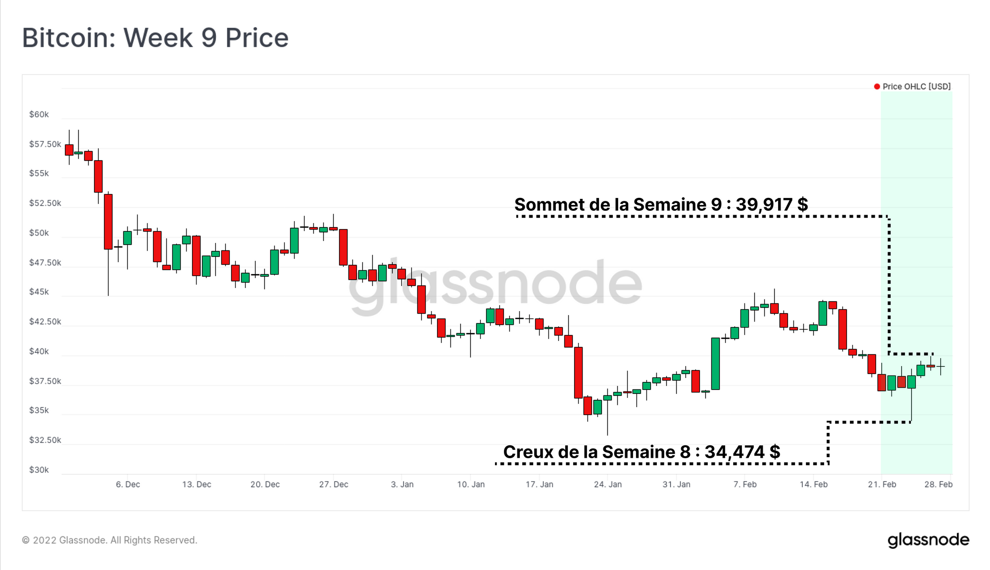 Les marchés mondiaux ont été confrontés à une semaine très décevante alors qu'un conflit armé éclate entre la Russie et l'Ukraine. En tant qu'actif macroéconomique mondial, avec des marchés ne fermant jamais, le prix du bitcoin a réagi de manière assez volatile. Cette semaine, le marché a baissé jusqu'à 34 474 $ avant de remonter rapidement jusqu'à 39 917 $.